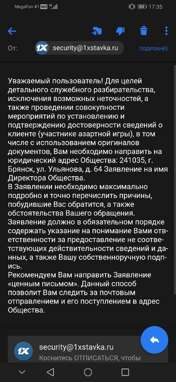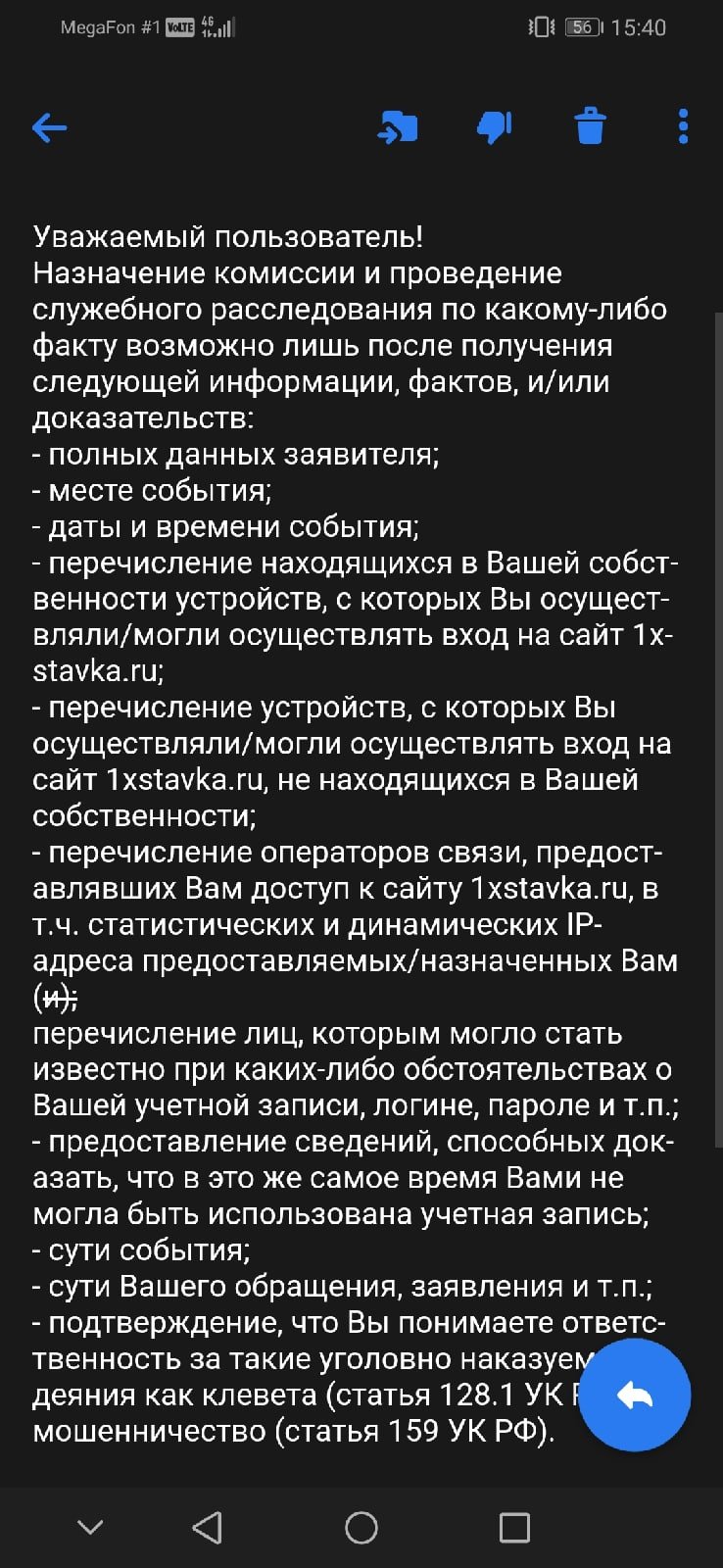 Здравствуйте, произошла такая ситуация в БК 1хСтавка, было выйгранно мной пари , за тем я попытался вывести деньги со счета,мне пришел отказ на вывод средств и запросили документы,я естественно все предоставил, еще запросили документы я опять предоставил,ожидаю, сегодня пришло письмо от Службы безопасности в 13:04 что "вывод средств разрешен" , я стал заходить в приложение 1хСтавка,но почему то меня выбило по какой то причине в приложении ,пришлось вводить заново логин пароль,но это было безуспешно много раз,минут 5 -7 пытался войти , проверял правильность логина пароля , но ни как не получилось,пришлось восстанавливать пароль заменой, смс сообщение на телефон пришло в 13:13 и 13:15 , так как два раза запросил смс, долго ждал первую, начал вводить то что пришло в смс на телефон но опять безуспешно(как будто не давало мне зайти по каким то причинам на мой аккаунт) , затем я звонил на горячую линию спрашивал что случилось,по какой причине я не могу зайти на свой аккаунт,мне ответили "пишите в службу безопасности" , далее через минут 20 30 ( был в дороге) я попытался опять зайти в свой аккаунт по последней смс с паролем у меня получилось , в личном кабинете я увидел баланс 30,копеек , был в шоке , не понимал как так, зашел в историю и увидел проигранные ставки , восемь ставок по 10 тысяч были проставлены(не мной) и соответственно проигранны ,поставленны они были в период 13:11 по 13:13 ,в это время я даже зайти не мог в аккаунт свой, написал опять в службу безопасности о случившемся,они мне прислали список необходимых документов чтобы я доказал что ставки были сделаны не мной, прошу помочь в этой ситуации Вас,так как я уверен в том что БК намеренно проставила заведомо проигранные пари!
