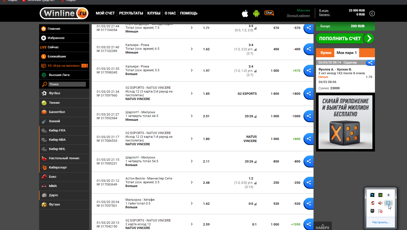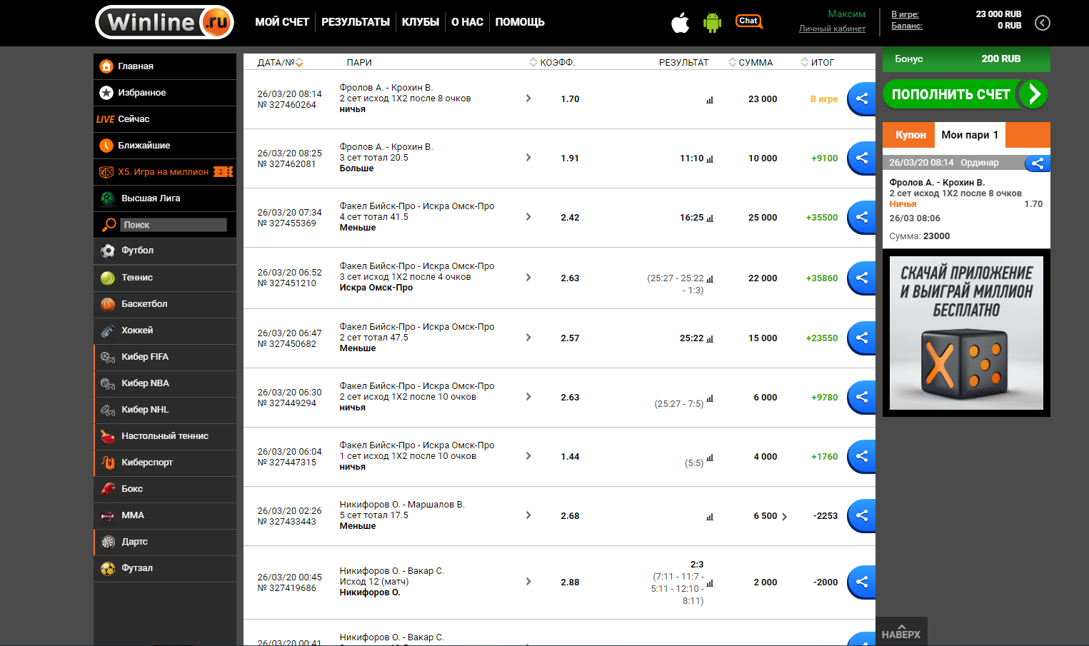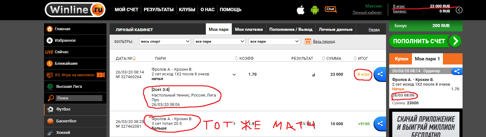 Здравствуйте, года сделал ставку на настольный теннис Россия (про лига) Фролов - Крохин в размере 23000р с коэффициентом 1,7 ставка зашла и её сразу рассчитали, выигрыш поступил на баланс и я поставил средства на вывод, заявку на выводы сделал утром,а вечером букмекер по необъяснимым мне причинам отменил вывод и обнулил баланс, а ставку, которая уже зашла и результат есть на всех официальных сайтах кинули обратно в купон ( то есть она не рассчитана), прям чудеса какие-то, я очень прошу разобраться в данной ситуации, выигрыш с данной ставки составляет 35000р, но учитывая насколько нагло себя ведёт букмекер прошу вернуть хотя бы 23000, которые я ставил!!! Счет привязан к мобильному телефону +79187761152 , обращение в службу поддержки бесполезны,все ответы в стиле "Букмекер оставляет за собой право делать что хочет"
