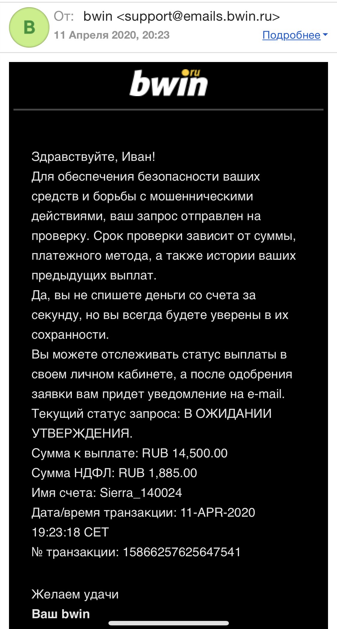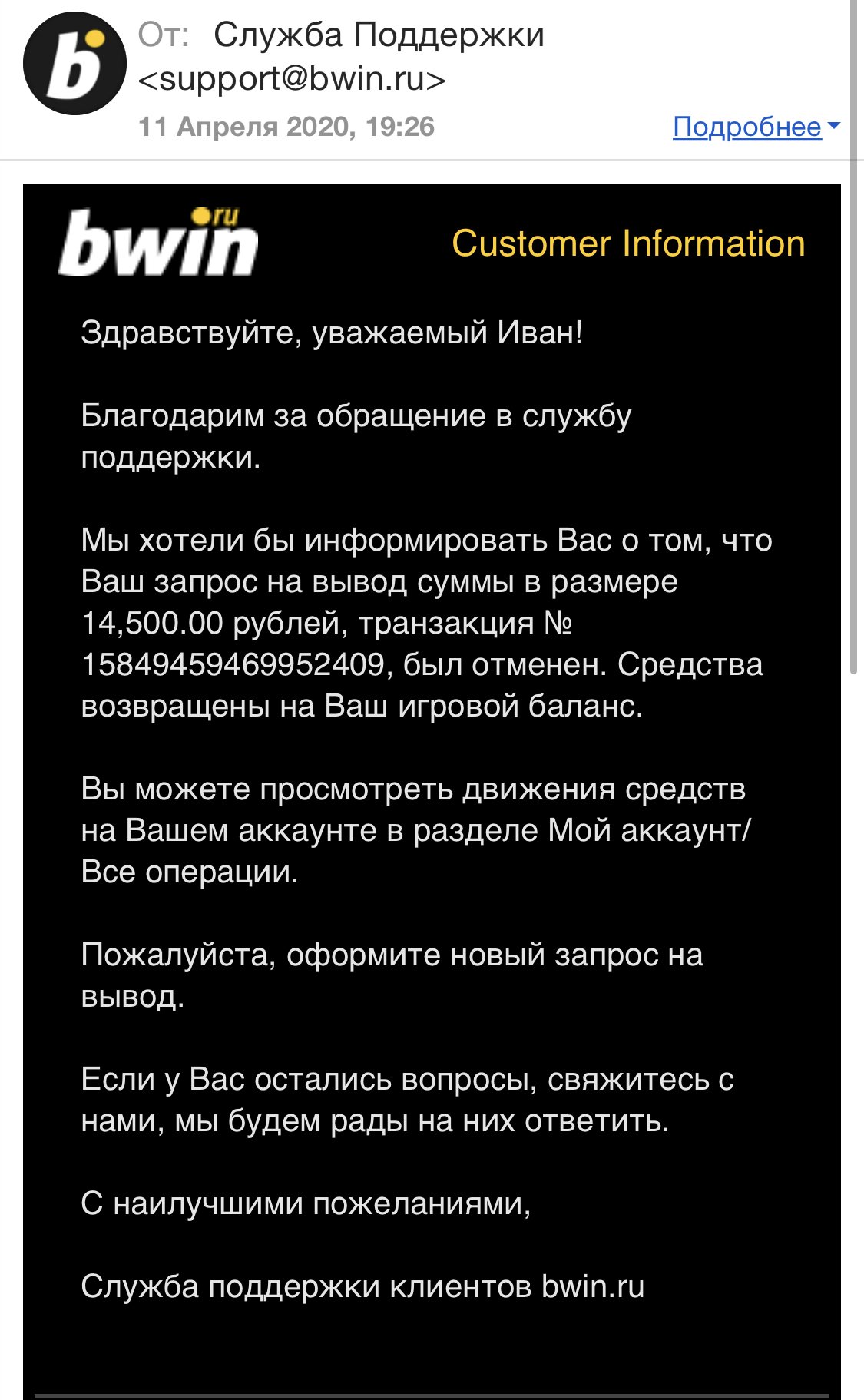 Здравствуйте, Легалбет! Прошу у Вас помощи! Зарегистрировался в бк Bwin, поставил несколько ставок и выиграл. Букмекер заблокировали мне аккаунт и не даёт вывести ₽. Написал письмо на почту, запросили документы, все сделал. Прошло уже 10 дней- ответа ни какого. Звоню- не отвечают. Пишу в онлайн-чат, который работает через раз, ссылаются на какие-то проверки, точных дат не называют. Читаю жалобы на букмекера, думаю зачем я там зарегистрировался? Уже не знаю, что делать, помогите пожалуйста!