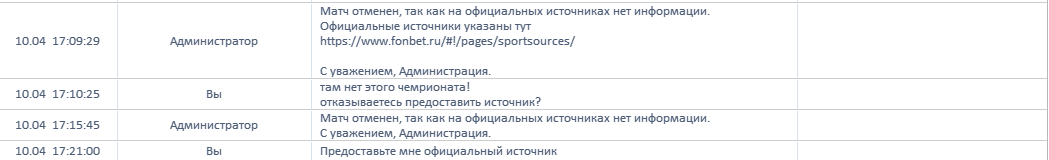 Здравствуйте, сделал ставку на бейсбольный матч чемпионата Тайваня, матч сыгран, результат известен, ставка выиграла, но букмекер пишет мне ересь, типа матч не состоялся, спрашивают у меня источник, я им отправляю, но они мне пишут, что это не официальный! Хотя у самих в правилах нет источника для этого чемпионата! Получается, если они не имеют официального источника для этого чемпионата, то матч не состоялся??? Бред полный или осознанное жулье!