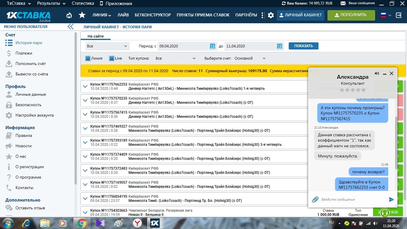 Неверно рассчитали пари на кибербаскетол в купонах Купон №11757662253, Купон №11757570235 и Купон №11757567415. Операторы пояснили, что результат 1ч отсутствует и поэтому возврат, а на всю игру результат есть. на скрине видно роспись счета игры (0-0; 0-0;0-0;73-72) Если они пишут результат 1ч 0-0, то пусть рассчитают купон выйгрышем, а не возвратом, или все купоны возвратом, тюк матч не состоялся, я его лично смотрел, он был отменен после 1ч. ссылка на протокол и скрины приложил