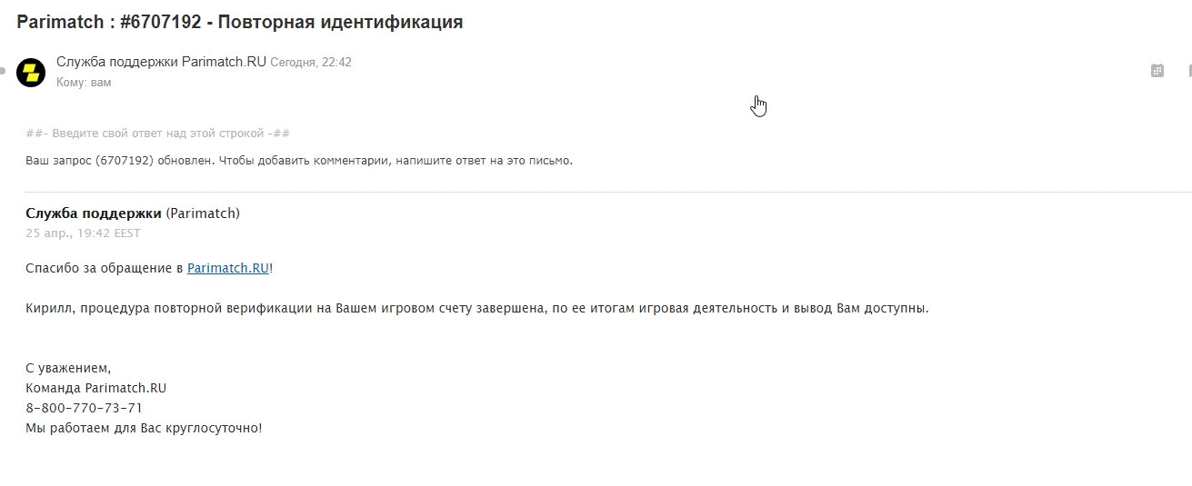 Здравствуйте! 11 апреля пополнил счёт на 700р - проиграл, потом пополнил счёт 14 апреля на 2300рублей - и снова проиграл, а потом ещё докинул 1000р, чтобы сделать ставку. В итоге из одной тысячи я сделал почти 24 тысячи рублей. Захотел вывести часть денег, чего мне сделать не дали, запросив повторную идентификацию. Написал в поддержку, мне сказали выслать им фото паспорта и моё фото с паспортом - это я сделал в тот же день. После чего я спросил у поддержки, сколько времени ещё займёт проверка, они мне ответили, что проверка занимает около 10 дней. Ответа до сих пор нет... думаю они хотят выдумать какую-нибудь причину, чтобы не отдавать мой выигрыш! Почитав на вашем сайте похожие темы я решил сразу написать сюда, не дожидаясь их ответа! Я никаких их правил не нарушал, никакого стороннего ПО, мультиаккаунтов и тд у меня НЕТ! А что они имеют в виду под этим "интерактивная ставка признана недобросовестной " - для меня это вообще загадка :) Очень надеюсь на вашу помощь, ведь БК явно не желает выплачивать деньги. Спасибо! p.s. 17 апреля также была одна странность, они почему-то отменили матч, который был сыгран! Я сразу же написал им в поддержку и они мне ответили, что в матче играл другой игрок, хотя всё было нормально, никаких замен не было! И сразу же после этого ставку рассчитали как победную!!! Опять же пытались меня обмануть... Док-ва будут ниже в комментариях!