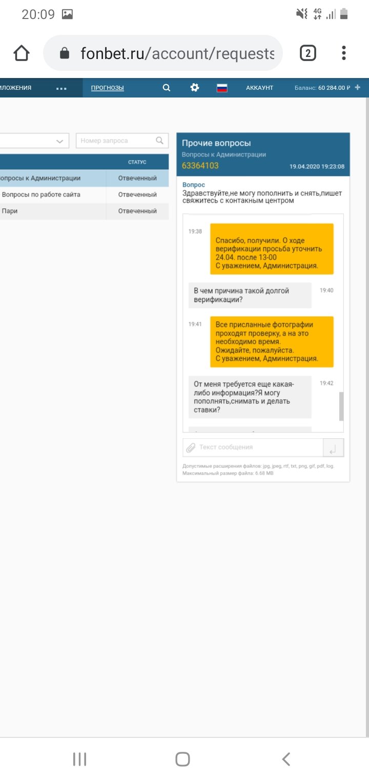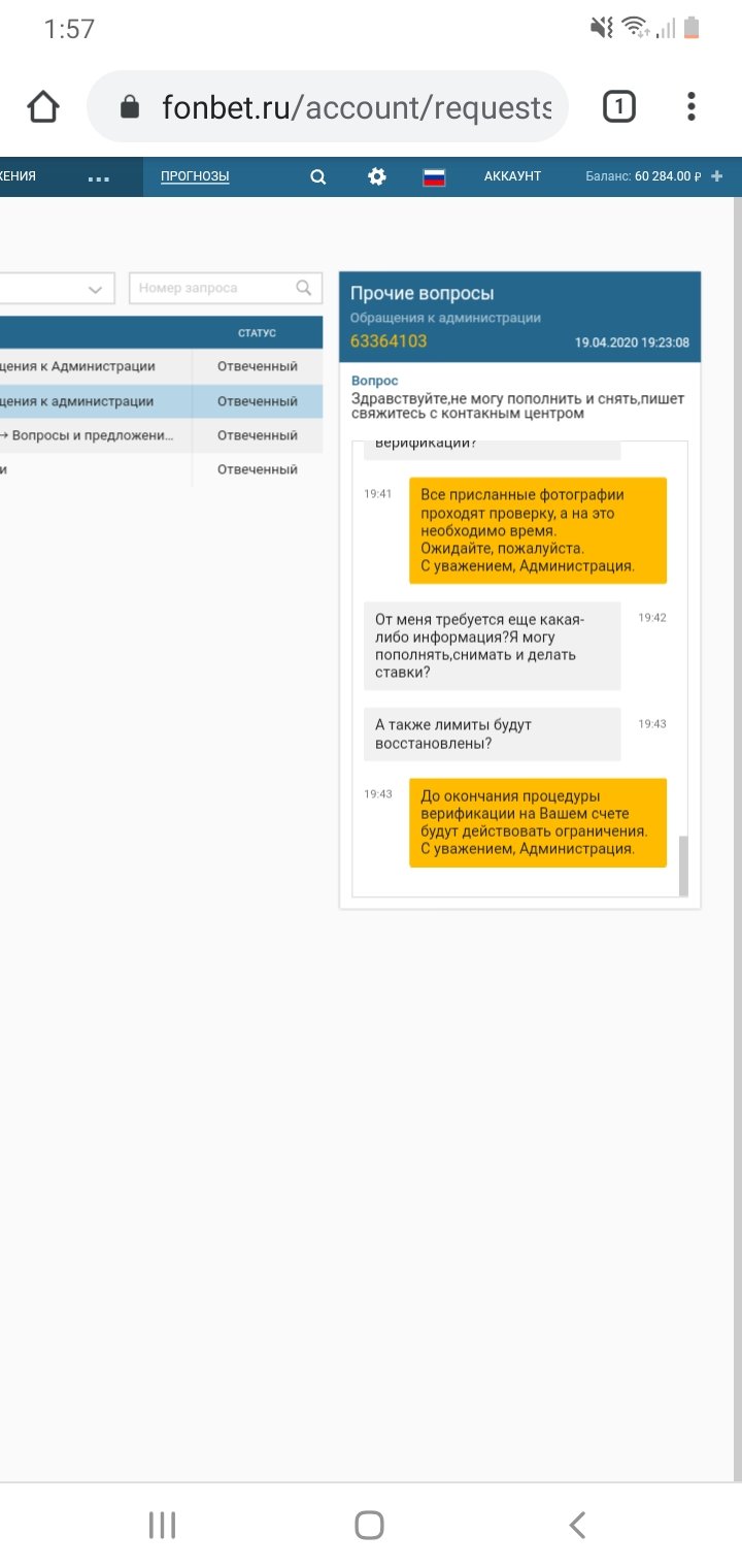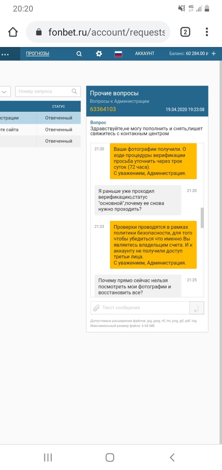 мне прилетело уведомление о прохождении дополнительной идентификации,не могу ни сделать ставку,ни снять,ни пополнить,а также урезана сумма ставки мною были высланы фото паспорта и прописки,паспорт рядом с лицом и датой на белом листе(),паспорта на фоне частично закрытой переписки с администрацией,а также фото паспорта на просвет.После отправки попросили связаться спустя 72 часа.Сегодня отправил фото банковской карты лицевую сторону рядом с паспортом,а также фото карты и паспорта рядом с лицом.Теперь написали свзаться после после 13 часов дня.На счету сумма 60284 рублей.Номер счета 3245679.Правил не нарушал,фото отправил качественные,хотя просили переотправить новые 1 раз все 4 фото .Прошу помощи,чтобы не затягивали время.