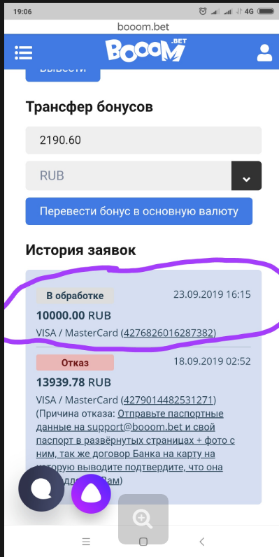 Здравствуйте. После того, как поставила на вывод 14 тыс.руб в БК Бингобум, они долго висели в обработке, далее- запросили кучу документов для верификации, что и было предоставлено( письма сохранились) , после чего кабинет заблокировали,всплывало окно, что такого емайла не существует у них в базе. Поддержка вяло отвечала, потом совсем никаких признаков жизни от нее не стало. Это было в двадцатых числах сентября 2019 г. 22 сентября письмо есть сохранившееся , отправляла документы для верификации. Писала ещё на сайт "Рейтинг БК", они опубликовали мою историю, но не помогли с возвратом денег. (Дата первого обращения не отображается корректно ниже в графе, поэтому - декабрь)