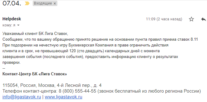 Добрый день! У меня случилась следующая неприятная ситуация. В БК Лига ставок я зарегистрирован около пяти лет. И на протяжении этого времени я периодически совершал ставки у данного букмекера. года мною было совершено три ставки на киберфутбол в лайве. Одно пари проиграло и два выиграло. После того как ставки были рассчитаны, я сформировал заявку на вывод денежных средств. После чего заявка находилась на рассмотрении. После 12 часов ожидания я обнаружил, что не могу зайти в личный кабинет на сайте БК. При обращении в службу технической поддержки мне сообщили, что доступ к аккаунту мне ограничен без объяснения причин. Для получения дополнительной информации мне было предложено написать в поддержку письменное обращение о возникшей проблеме, Что мной было незамедлительно сделано. Мое обращение было зарегистрировано и принято к рассмотрению. И рассматривается до сих пор. Прошу помочь или проконсультировать в данной ситуации, как лучше поступить. Заранее благодарен!
