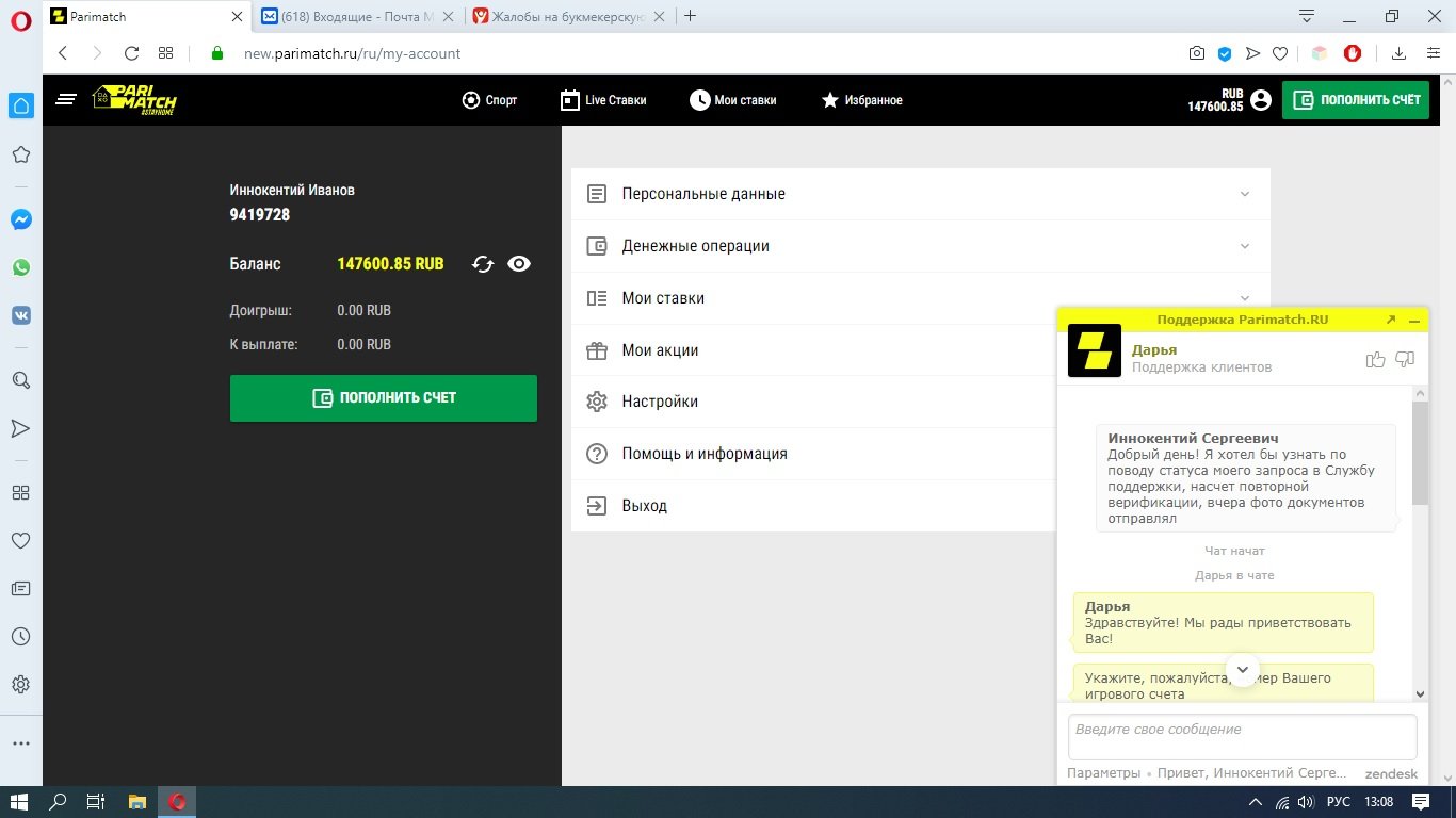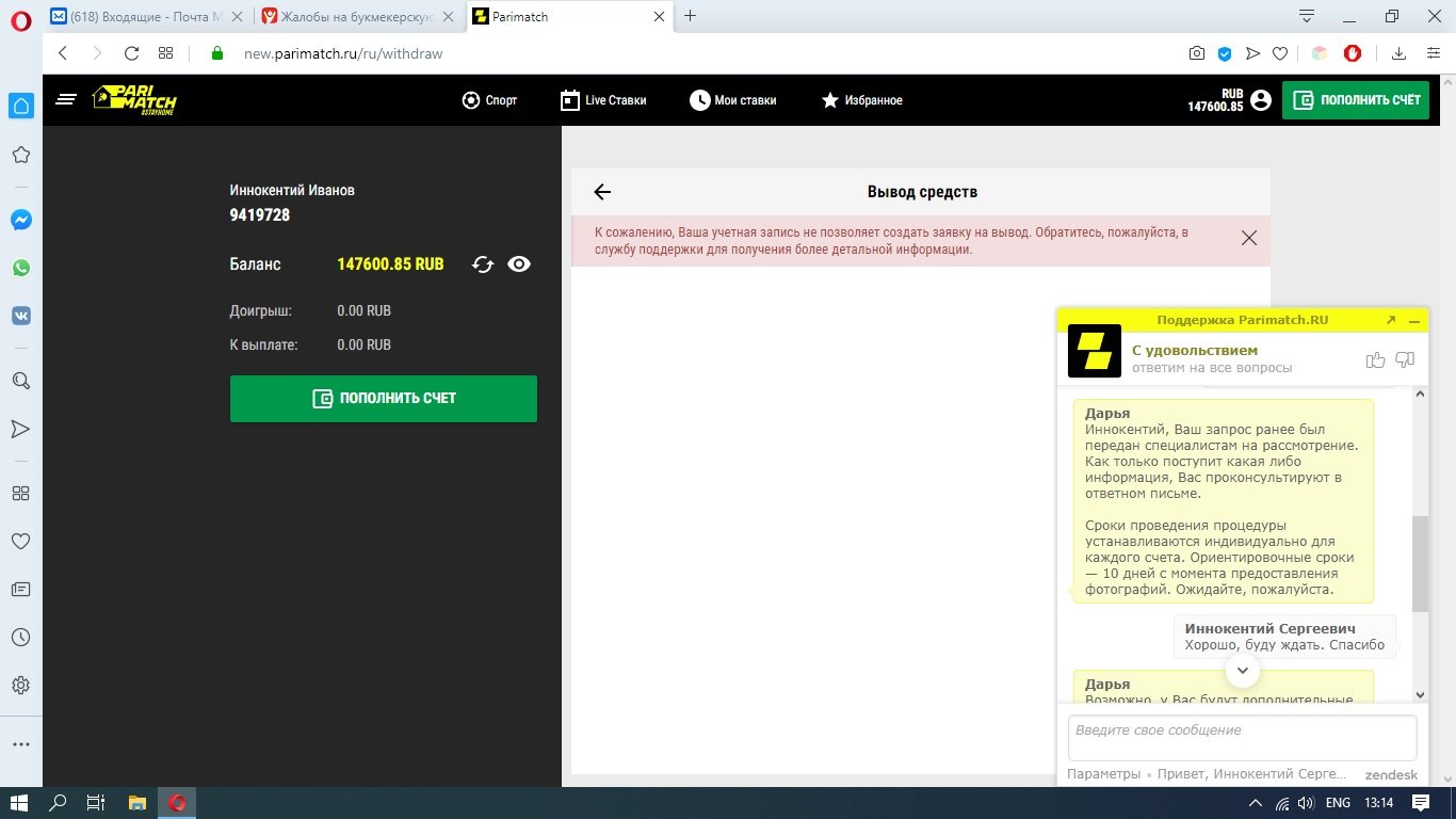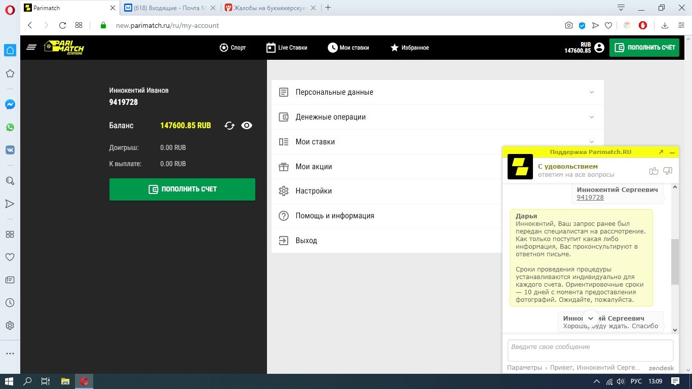 Здравствуйте! Мой лицевой счет в Париматче 9419728. Поставил в денежные средства на вывод в субботу 25 апреля 2020 года, сумма 140000 рублей, по выплате отказали, сообщили, что нужно пройти повторную процедуру верификации. На их запрос отправил им фото паспорта и селфи с паспортом. Затем запросили отправить фото паспорта еще раз, с регистрацией, и с квитанцией ЖКУ. Паспорт настоящий, все документы легальны, так как я ранее проходил верификацию в салоне Лиги ставок. Не могу вывести уже 5 день, сегодня так же отправлял фото паспорта. Помогите пожалуйста разобраться в данной ситуации. Скрины со своего аккаунта приложил с своему обращению