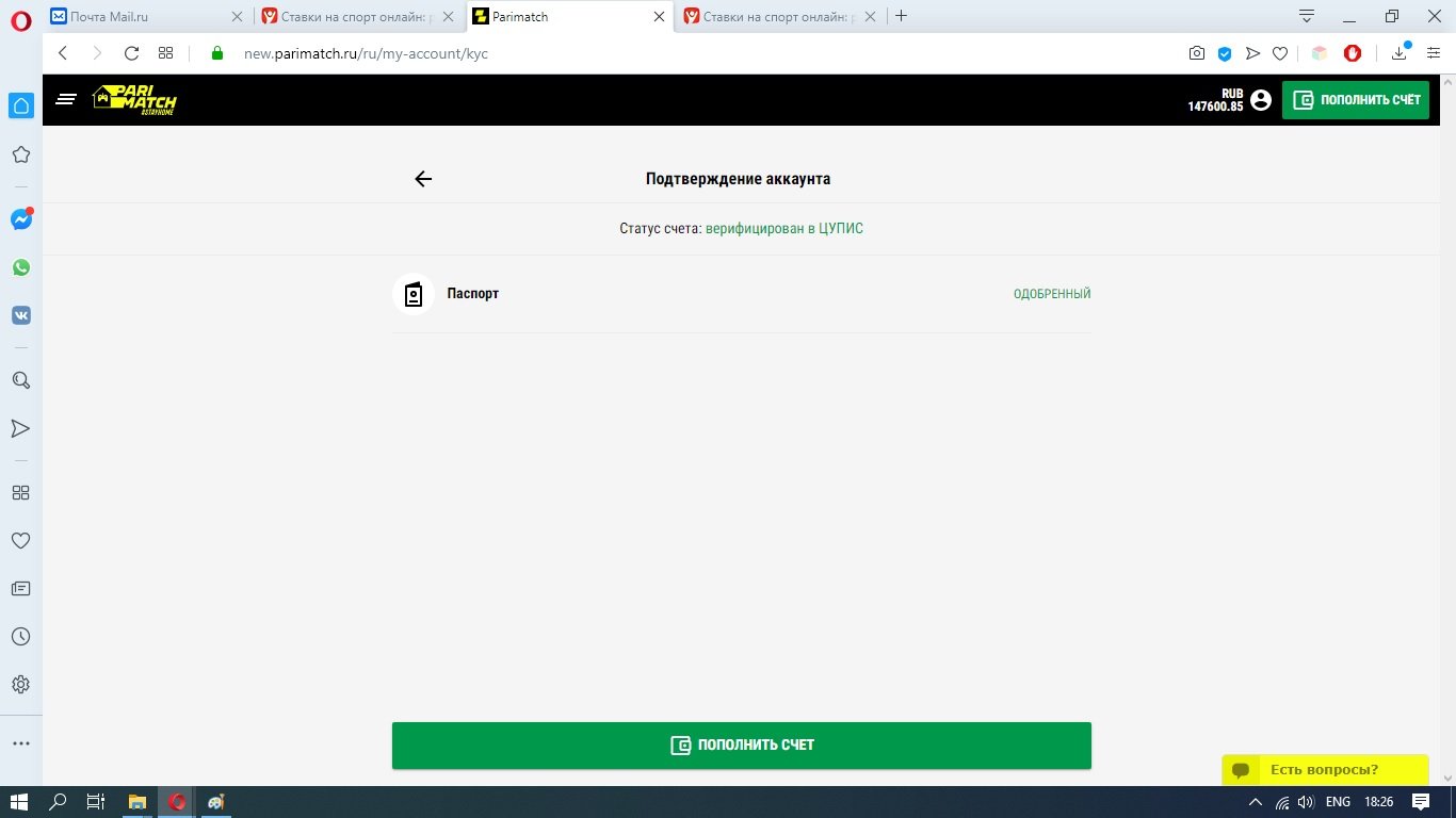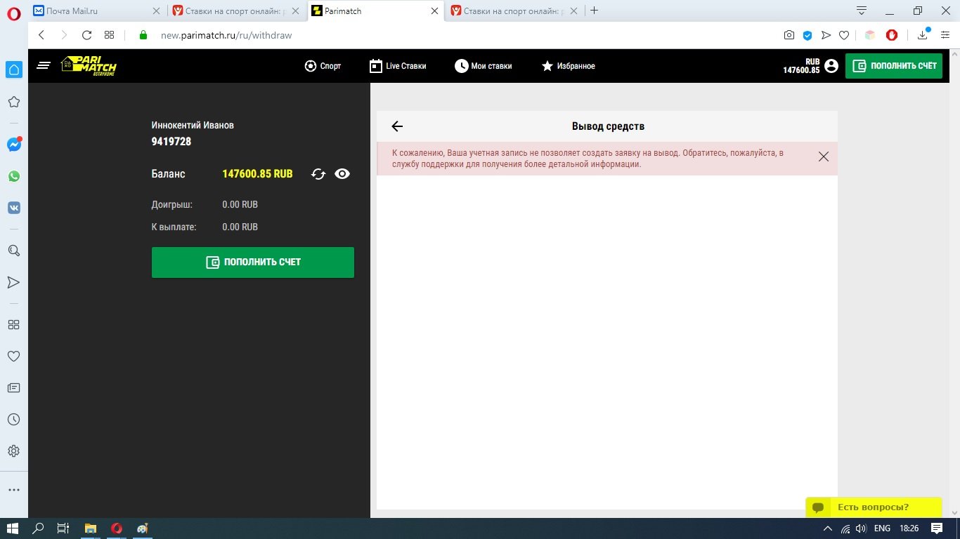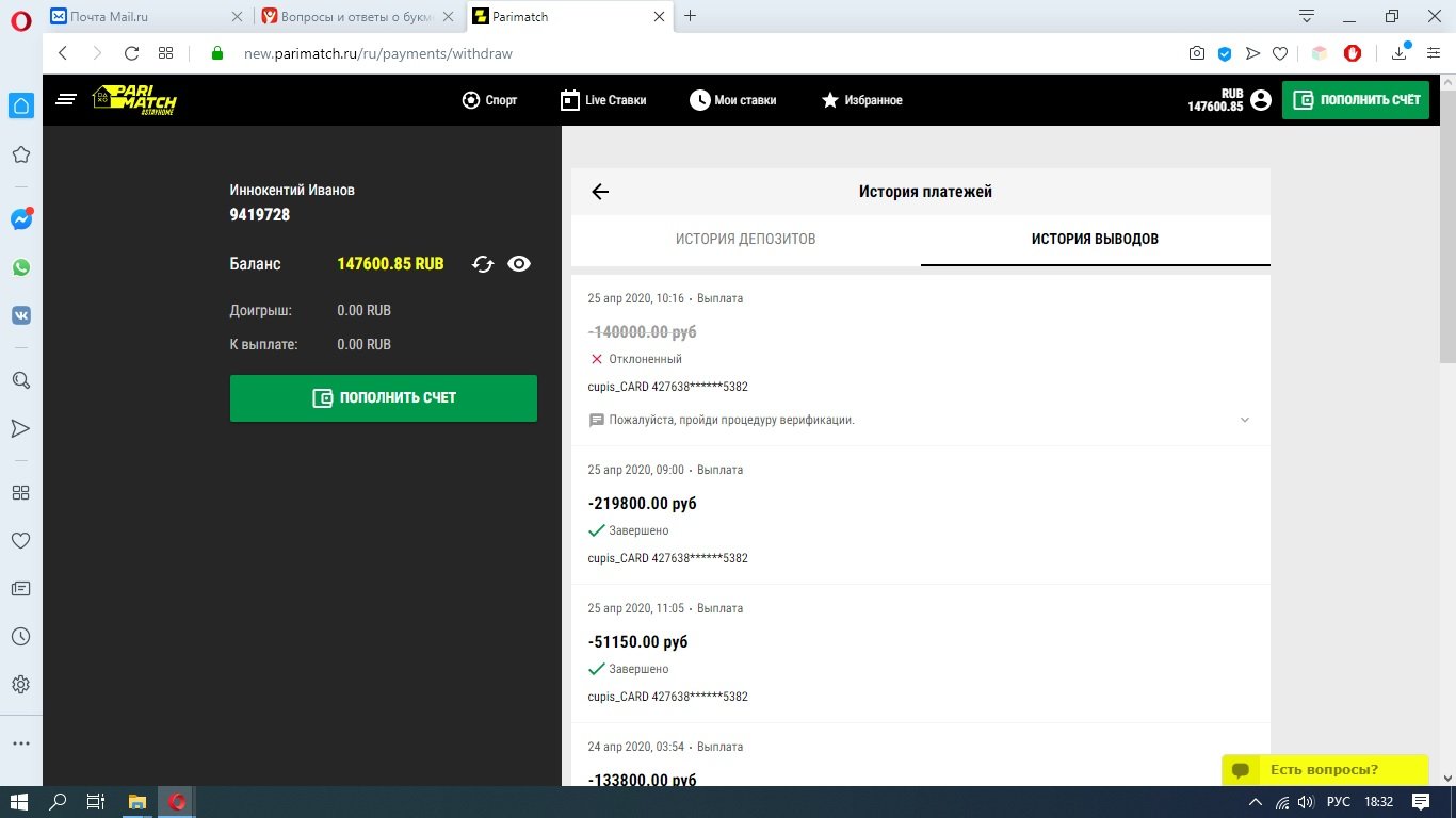 Здравствуйте! Мой лицевой счет в Париматче 9419728. Поставил в денежные средства на вывод в субботу 25 апреля 2020 года, сумма 140000 рублей, по выплате отказали, сообщили, что нужно пройти повторную процедуру верификации. На их запрос отправил им фото паспорта и селфи с паспортом. Затем запросили отправить фото паспорта еще раз, с регистрацией, и с квитанцией ЖКУ. Паспорт настоящий, все документы легальны, так как я ранее проходил верификацию в салоне Лиги ставок. Не могу вывести уже 5 день, сегодня так же отправлял фото паспорта. Помогите пожалуйста разобраться в данной ситуации. Скрины со своего аккаунта приложил с своему обращению