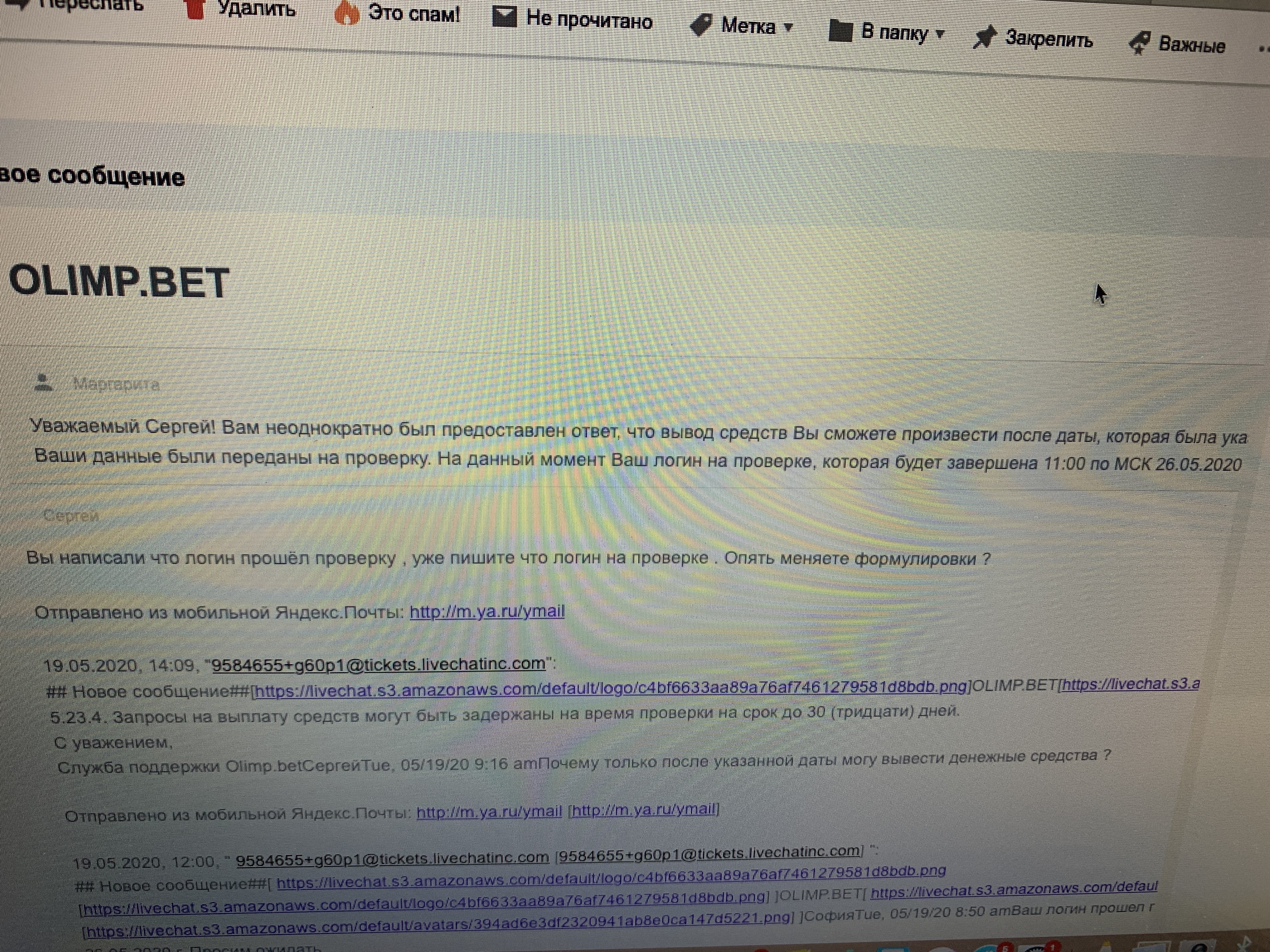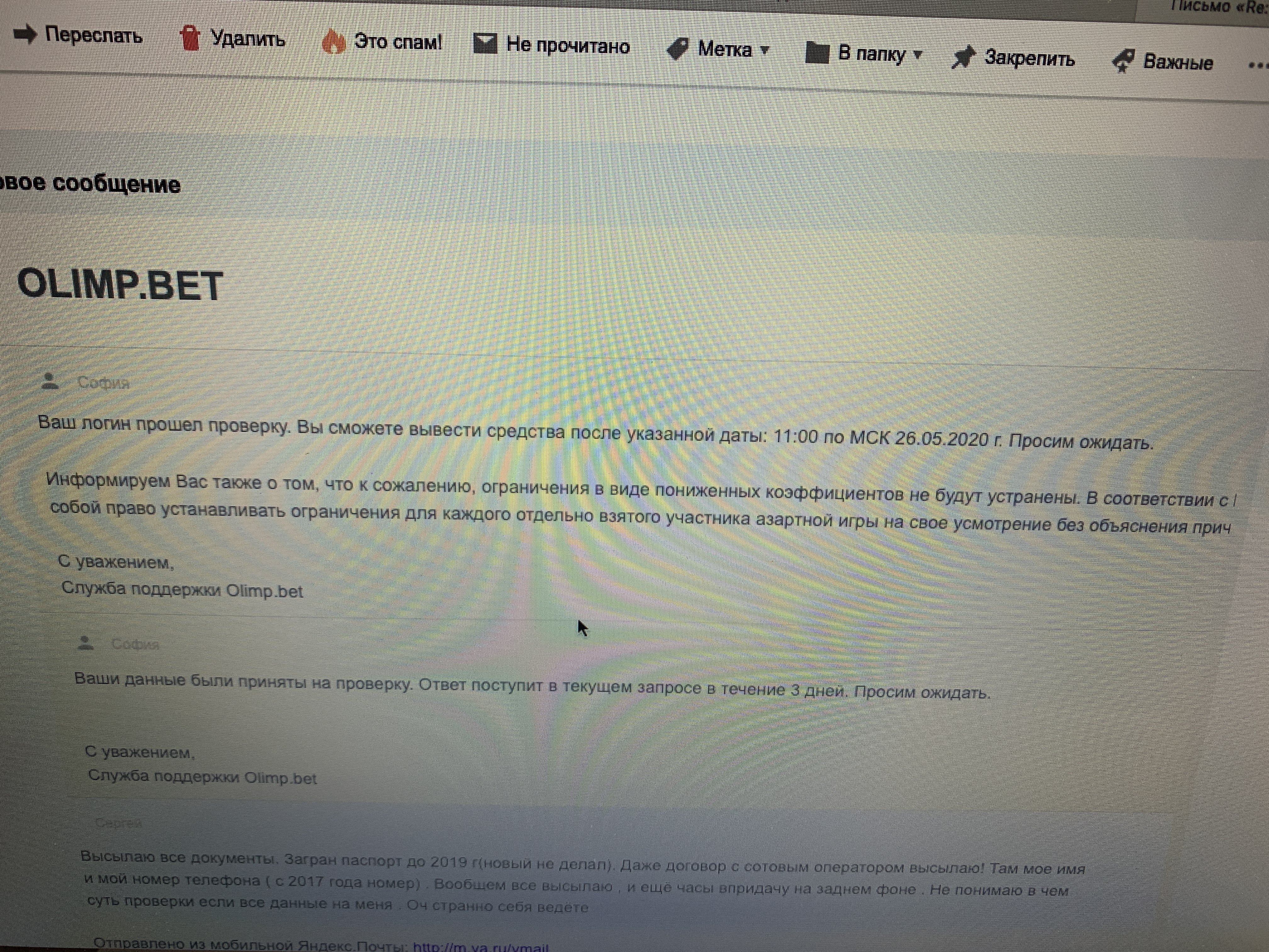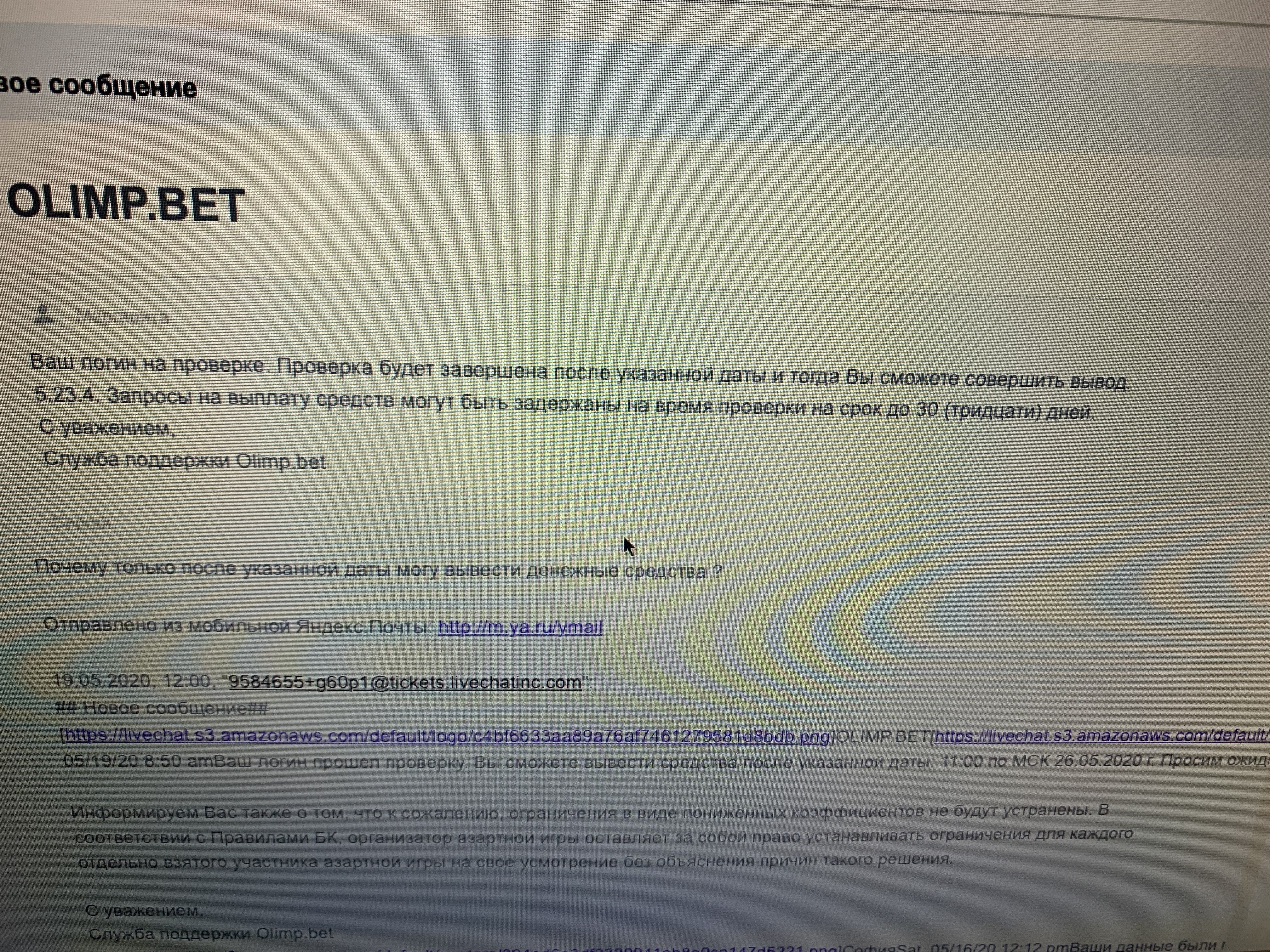 Здравствуйте , бк Олимп не выводят деньги на кошелёк уже вторые сутки хотя в правилах у них до 24 часов , написал им в тех .поддержку - передо мной извинились и сказали что деньги поступят в течение 1-3 часов ( все скрины есть). В итоге по прошествии времени - деньги вернули на игровой счёт . И написали что требуется дополнительная верификация . Сумма на счету 57 тыс . Олимп , Вынужден буду обратиться в правоохранительные органы если деньги не будут выведены . Помогите решить вопрос . Номер счета 4489360