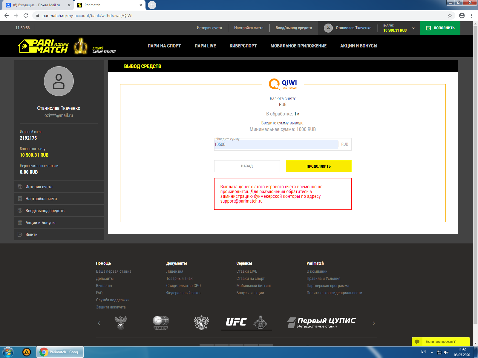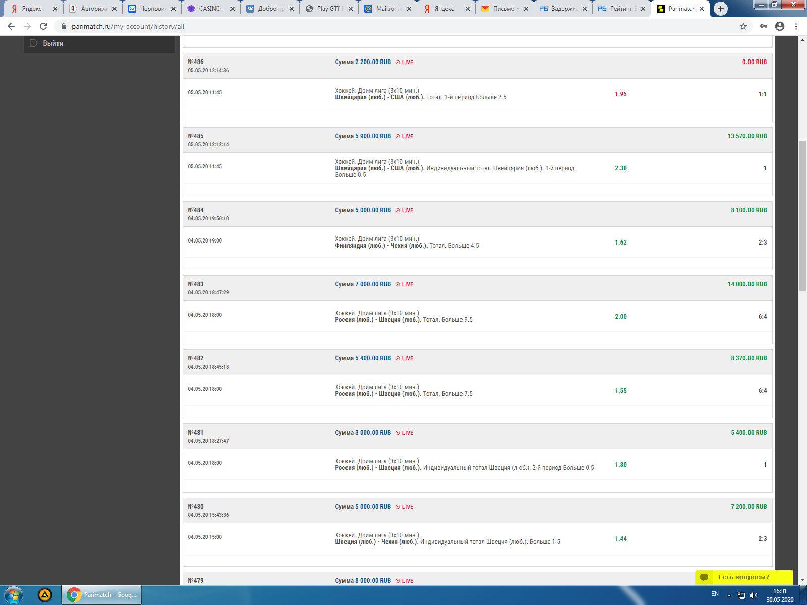 Зарегистрировался в конторе париматча в мае 2018 счет 2192175 . Как выйгрывал так проигрывал.все нравилось у букмекера всегда был в хороших отношениях за 2019г около 160т выйграл все выплатили. Ну теперь по делу 4 мая 2020 сделал депозит 3000 тр поднялся до 13000 тр вывел 8000 тр. С 5000 тр поднялся до 10500 тр при попытке вывести средства потребовали дополнительную верификацию ну надо так надо думаю хотя у меня ЦУпис полностью верифицирован .Сначала требовали фото с разных ракурсов отправил приняли потом квитанцию жкх сделал и видео верификацию тоже сотрудник их сказал все нормально можете выводить. захожу в кабинет делаю запрос и меня выкидует с личного кабинета))) Думаю сбой какой то а нет мой выйгрыш после недели верификации RUB Списание средств согласно п.п. 12.3 12.4 7.1. после чего пришло письмо счастья все ставки анулированы а выйгрыш списан. Я не использовал вилки, прогнозы или мультиаккаунты.Но при этом контора украла 10 тысяч моего честного выигрыша, даже не указав конкретную причину, за что сняли деньги .Прошу вас как независимый сервис разобратся в данной ситуации/.все скришоты что им отсылал по верификации я вам предоставлю