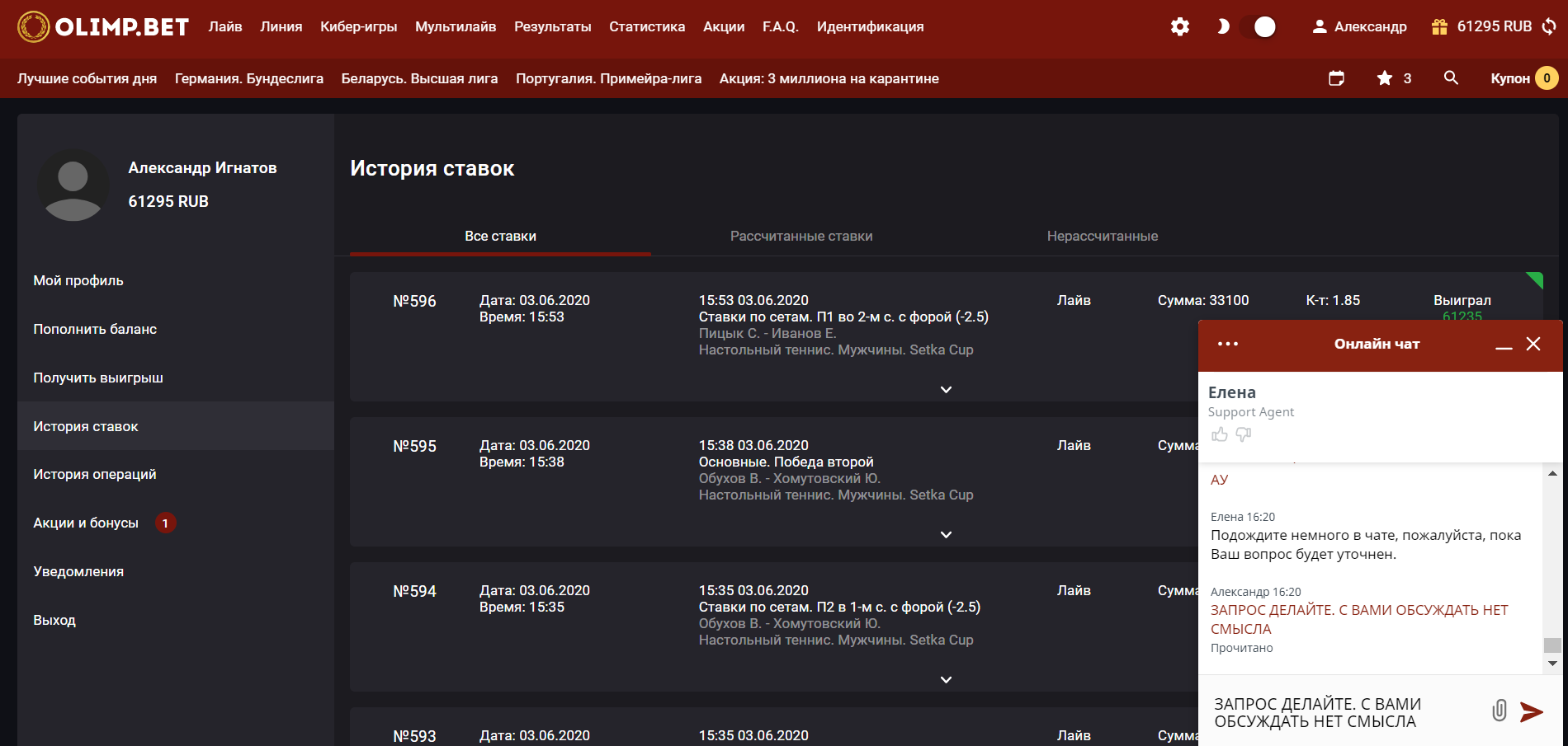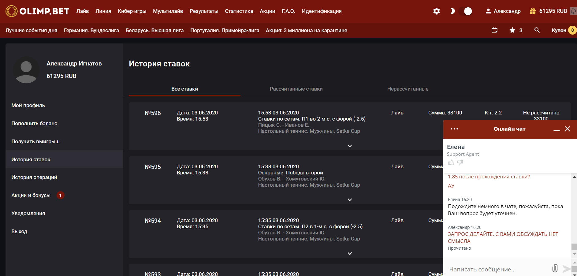 Доброй ночи.Номер счета 9091520. Играю в Олимпе давно,нахожусь в жестком минусе,но то как поступает Олимп когда выигрываешь хоть немного просто поражает. После ставок в лайве заметил,что на счету должно быть больше денег чем есть и просто не поверил глазам- Олимп ПЕРЕСЧИТЫВАЕТ выигрышные кэфы в лайве после окончания событий. Вот 2 скриншота моих ставок на настольный теннис.Первый - мои ставки в лайве,все ставки на фору 1 (-2.5) в первом втором и третьем сете. На всех кэф одинаковый , и . Но что делает Олимп после матча? Он ПЕРЕСЧИТЫВАЕТ мне кэф третьего сета с до - Скриншот 2. Абсолютно точно это ставки до начала сета. На все мои гневные обращения они пишут,что это был рыночный кэф. Но как это возможно,если первые два сета и именно это был рыночный кэф,да и на третий сет было примерно тоже самое у всех букмекеров. Что это вообще за дичь? Пусть пересчитывают либо понижайте им рейтинг. ПОЗОР