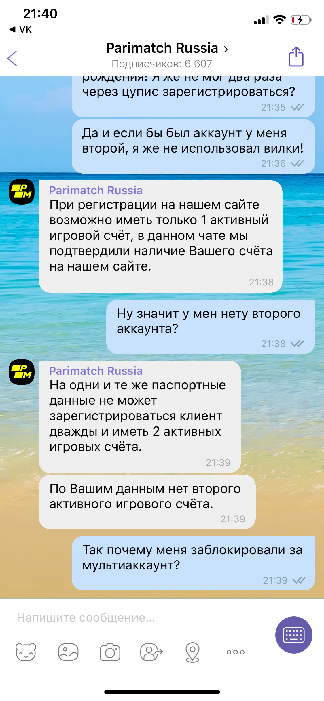 Здравствуйте, хочу попросить помощи у грамотных специалистов! года захотел установить приложение на телефон, и поиграть именно в конторе Париматч. На всякий случай при регистрации нажал на ссылку « забыл пароль», чтобы узнать есть ли у меня уже аккаунт в данной конторе! На что мною было получено письмо на электронную почту, цитата - «к сожалению, у нас отсутствует информация о Вашем игровом счете, и предлагают пройти регистрацию! Значит думаю нету аккаунта, вёл данные получил пароль, и мне начислили бонус в размере 150 % от первого депозита, который составлял 5000 рублей! Играл в основном на футбол Немецкую Бундеслигу, где за два дня выиграл 30000 рублей. Мною была принята попытка вывести часть суммы, что безуспешно! Оказывается по условие акции мне надо отыграть на сумму 60000 рублей с кэф 1.7, думаю ладно, сам виноват так как не читал изначально условие! На следующий день хотел просто отыграть эту акцию, ставил на любые события, главное чтоб был кэф 1,7, после трех - четырёх ставок с моего счёта списали 3000, в дальнейшем оказалось это те самые средства, который мне были представлены в качестве бонуса! Выяснилось что меня лишили этой самой акции без объяснение причин, о которой сказано в правилах акции! Думаю ладно, хотяб верну отставшую сумму, но меня заставили пройти повторную верификацию, хотя я регистрировался через цупис! После отправление всех фоток и квитанции жкх прошло 15 дней! После мне позвонили по скайпу где расспрашивали о моих ставок и других мелочей! Сегодня пришёл ответ что меня заблокировали за мультиаккаунт, и из за этого списали усю сумму за исключением 5000 который я внёс! Помогите пожалуйста разобраться, ведь я регистрировался и подтверждался через Цупис! И до регистрации мне пришло письмо что у меня нету аккаунта в париматч, почему они щас обвиняют меня в мультиаккаунте?
