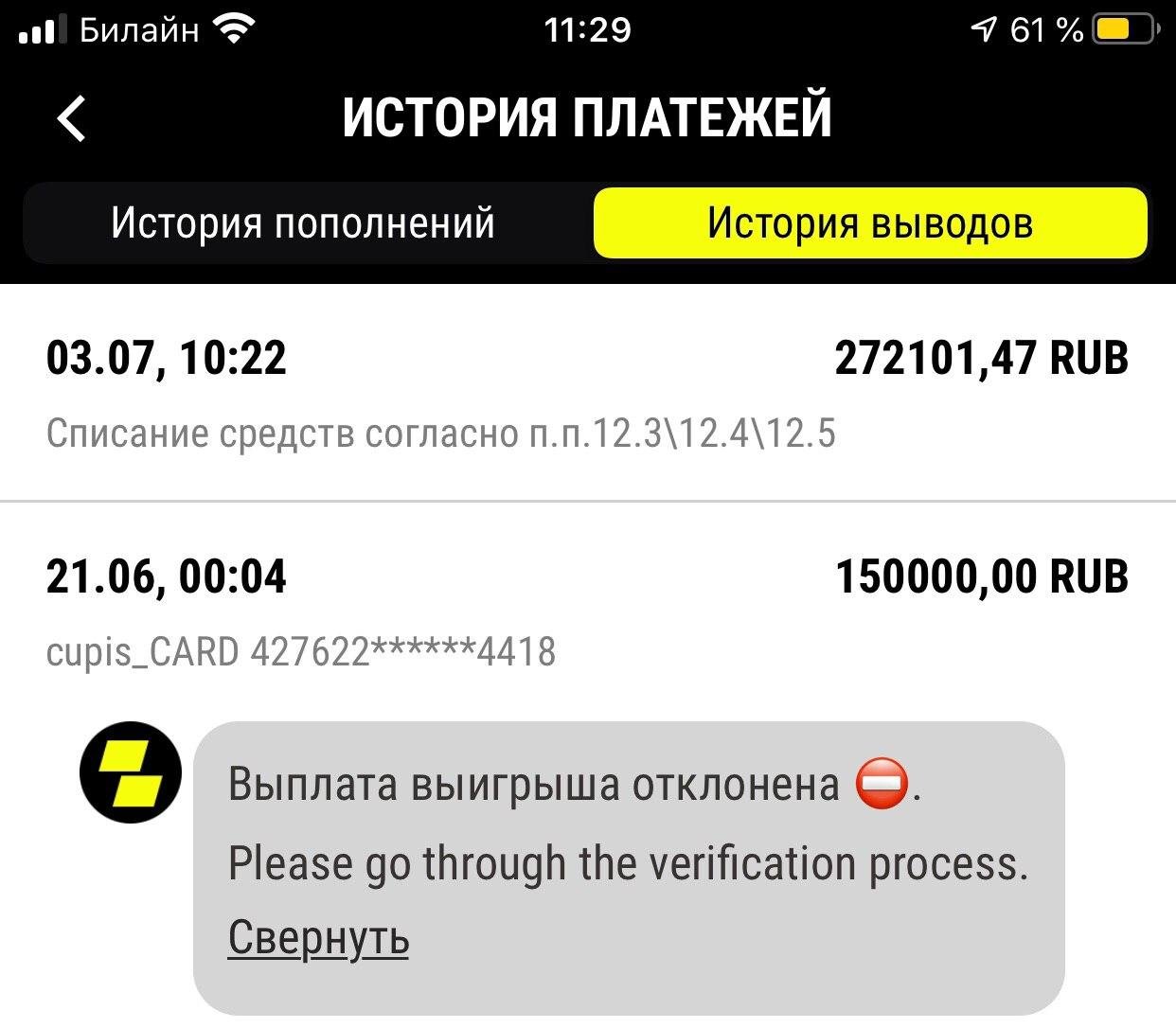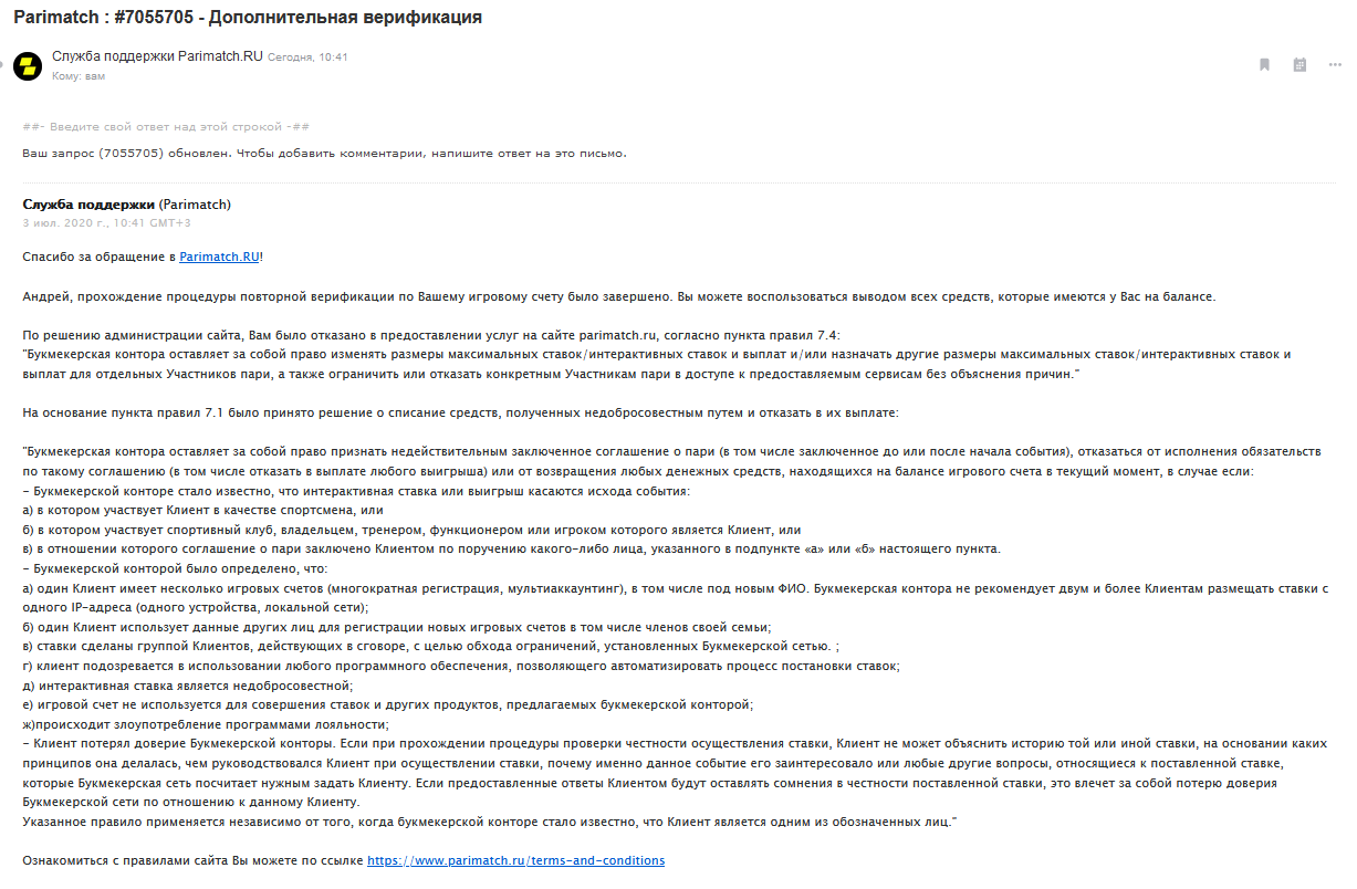 Здравствуйте Legalbet, расскажу вам свою историю и прошу вашей помощи, так как света в конце туннеля пока не вижу. Пользуюсь Pari Match достаточно давно, бывали как провальные серии, бывали и неплохие, последнее время достаточно много ставок на шорт-хоккей и прочее кибер спорт движение и тд, как и у всех, т.к. спорта 2 месяца не было, сначала лимиты почему то порезали на хоккей, видимо это был 1й звоночек, которому я не придал особенного значения. Многие блогеры рекламируют данный БК как проверенный и честный, моя ситуация вообще ввергла меня в шок, что легальная контора может творить такие вещи. В ночь с 20 на 21 июня я запросил на вывод средств 150000, в итоге утром увидел следующую ситуацию (фото1, фото2), т.е. при выводе средств программа пишет, что ваша учётная запись не позволяет создать заявку на вывод, обратитесь в службу техподдержки. Далее, само собой, по почте техподдержка запросила стандартные фото с паспортом и листиком с надписью для и сказали ожидать(фото3). Опять же есть некоторые специфические требования к этим фото, самому их сделать не так уж и просто, ну ладно, в принципе именно в этом ничего страшного нет, это нормальные требования. Шло время, тишина.... 24 июня запросили дополнительную информацию к дополнительной верификации, где попросили сделать фото квитанций за коммунальные услуги (крайние 3 месяца) (фото4).... Отправил... Сказали ожидайте. Естественно у любого нормального человека возникает сразу вопрос, ЗАЧЕМ всё это и почему тааааак долго?! После этого 27 июня запросил, что вообще происходит и почему такая затяжка. На что ответа конечно не получил. По телефону ссылаются на 10 дней, которые могут рассматривать данные. НО! Интересно то, что Пополнение счёта открыто, ставки можно ставить (возможно расчёт на то, что как часто бывает в ожидании человек просто проигрывает всё). На счёте получается около 250000. Конечно в шоке просто от такой ситуации, тем более от БК Pari Match. Ну судя по участившимся в последнее время жалоб по непонятным блокировкам именно этой БК, то что то идёт не так. И вот когда истекали обещанные 10 дней, на почту приходит новый запрос (фото5), с просьбой предоставить ещё ДРУГИЕ квитанции по оплате за квартиру последние 3 месяца, я конечно ответил и на это письмо (фото6), в итоге всё снова приняли (фото7) и стандартно ответили, что сроки рассмотрения индивидуальны, но на этот раз ещё написали, что возможность уточнить сроки отсутствует... Т.е. Тем самым снова продлили всё на новый круг в 10 дней. Я уже понял, что их задача просто затянуть и дождаться когда человек перестанет отвечать и слать им. Ибо верификацию уже можно было 300 раз провести, данных более чем, тут видимо задача просто совершенно другая. Дело «Гафарова и Партнёры», которое сейчас на слуху и действительно чистой воды обман процветает как получается и у легального БК, которые многие даже рекламируют, совершенно безосновательные действия от БК!!! Очень рассчитываю на вашу помощь LegalBet, ситуация совершенно незаконная.