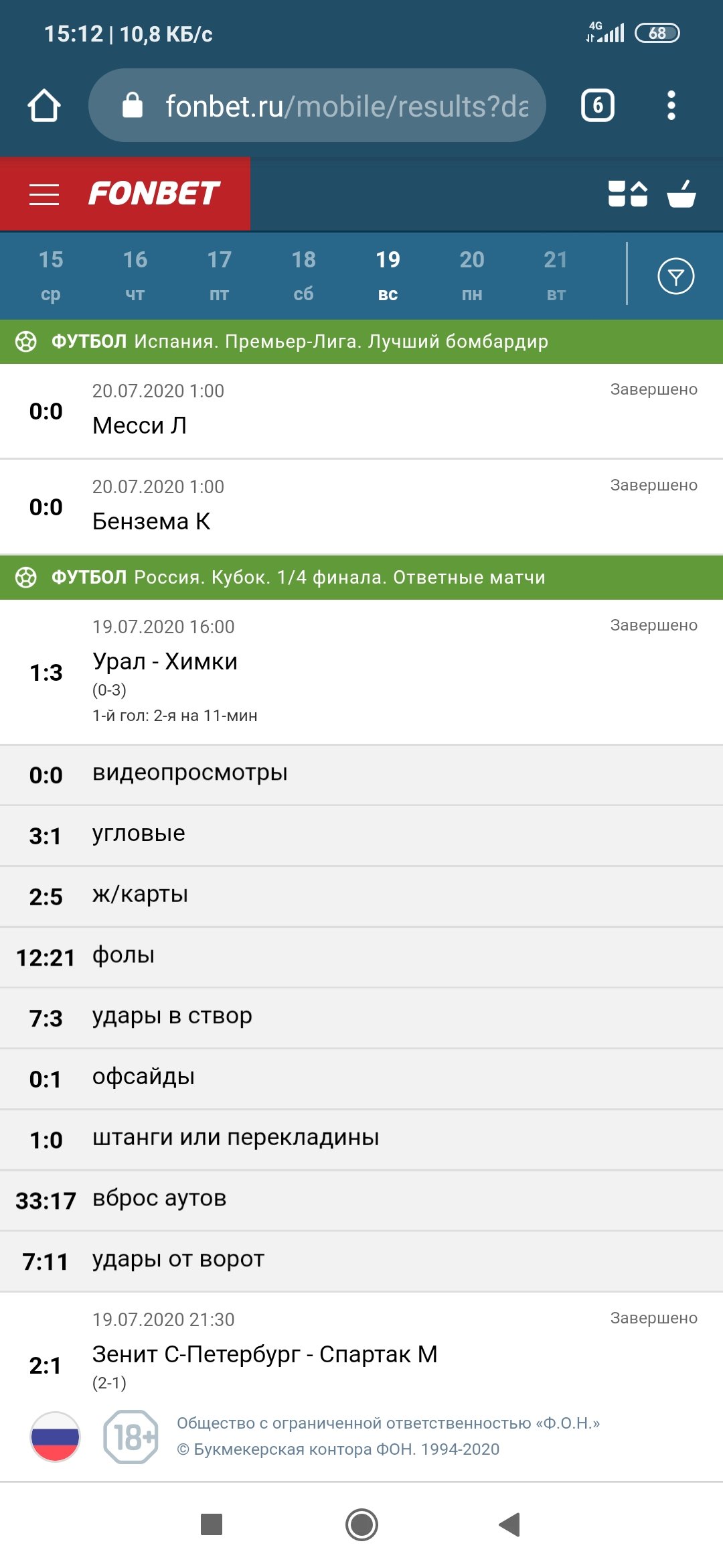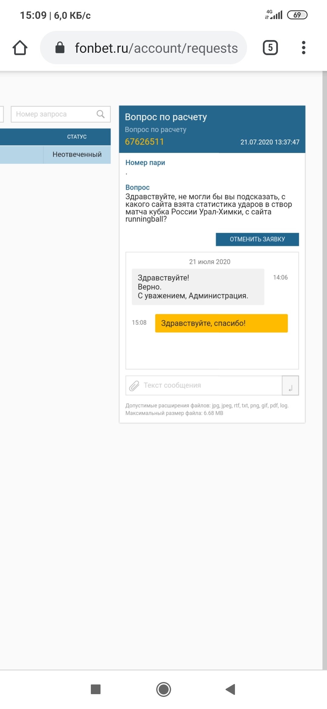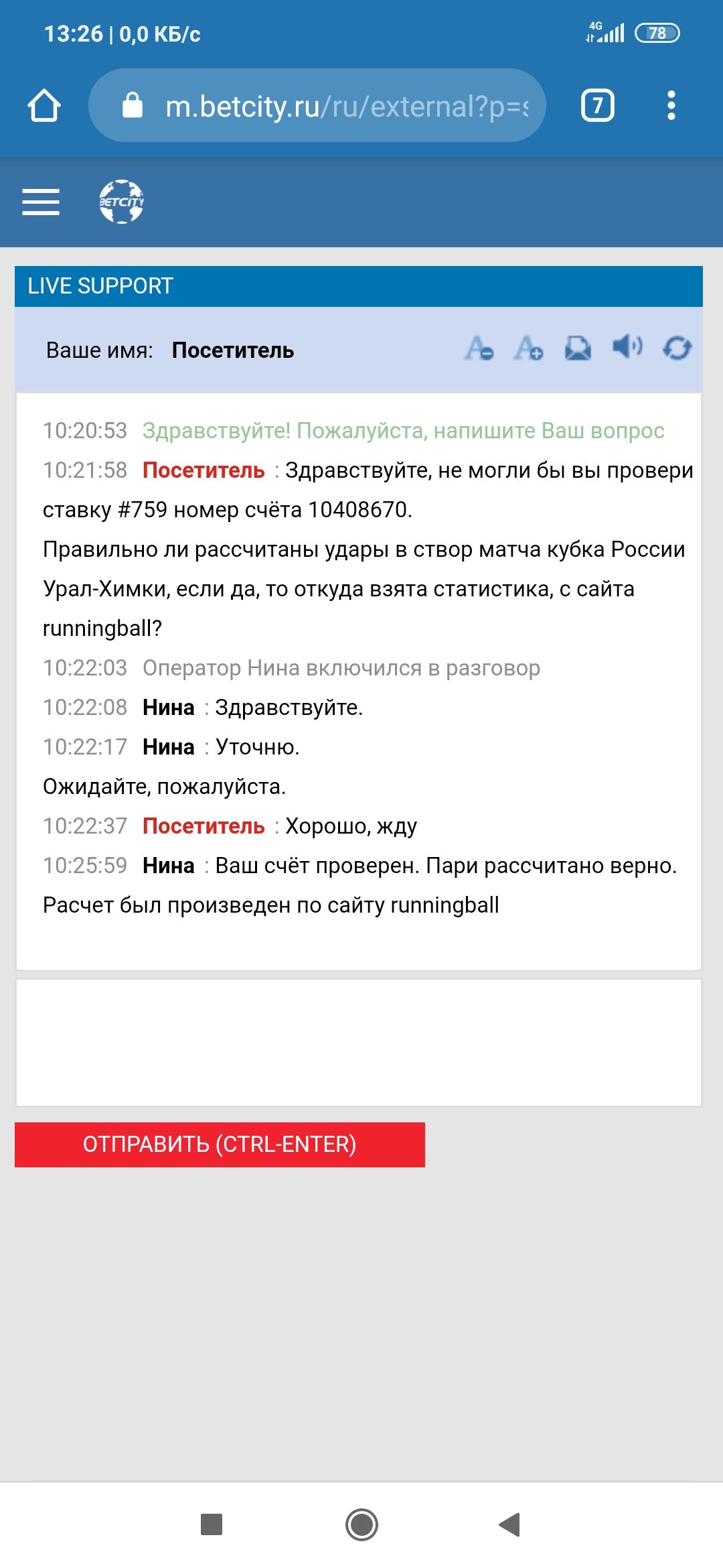 Здравствуйте, делал двойник , в котором была ставка на удары в сторону ворот матча кубка России Зенит-Спартак ТМ 29.5 , рассчитали как проигрыш , ударов было сделано 16-14. Рассчет произведен на основе сайта runningball, скриншот статистики этого матча с этого сайта мне конечно же отказались показать.На всех сайтах с результатами, других букмекерских конторах нигде нету таких цифр, несколько скриншотов прикрепляю, знаю что это не источники Betcity, но все же. Я считаю, что betcity рассчитали мою ставку неверно. Привожу ещё один довод в свою пользу, чуть ранее была сделана ставка на удары в створ матча кубка России Урал-Химки, ставил на 10.5 М, рассчитали как 8-3, всё потому же сайту runningball,. Захожу на сайт Фонбет, где в источниках информации указан официальный сайт премьер лиги, так как там нет результатов , то информацию берут с сайта runningball, как дополнительный, а на сайте Фонбета эта же ставка рассчитана как 7-3. Возможно я просто ошибаюсь, точную информацию мне отказались дать. Но изучив правила Фонбета, вышло что ставка рассчитана по сайту runningball.