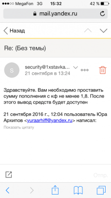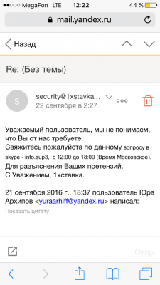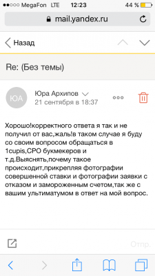 Здравствуйте! 1.Я,Архипов Юрий Игоревич,+79296936173 2.Мои права были нарушены букмекерской конторой 1xstavka, Первая СРО Букмекеров(№12 от ) 1xstavka оперирует с июля 2016 года на основании лицензии №17 ФНС РФ, выданной ООО «Букмекер Паб» 1 октября 2010 года. После завершения спортивного события,я сделал заявку на вывод средств,в чем мне отказали без какой либо на то причины.В то же время я позвонил на горячую линию 1xstavka и задал вопрос почему мне отказали в выводе средств.Оператор ответил,что по всем вопросам,касающимся отказов,обращаться в службу безопасности,с письмом на электронную почту. на электронную почту службы безопасности()я написал письмо с вопросом,почему мне отказали в выводе средств.На что мне ответили,поставив ультиматум.Пока я не проставлю сумму пополнения с коэффициентом не менее 1.8,вывод средств будет недоступен. Весь вопрос заключается в том,что данная букмекерская контора отказывается возвращать денежные средства с моего игрового счёта,который заморожен по необъяснимым причинам,говоря о том,что выдача средств станет мне доступной только после проставления мною ставки с определенным коэффициентом. В связи с чем я должен проставить какую-то сумму с определенным коэффициентом?!непонятно. Самое удивительное,что после моего ответа службе безопасности,о том что я буду с этим вопросом обращаться в такие организации как 1цупис и Первая СРО букмекеров,мне быстро почистили историю ставок и закрыли в дальнейшем доступ в игровой аккаунт. На данный момент я ни то что бы историю посмотреть не могу,я теперь и в аккаун свой игровой не могу зайти... Поскольку мне его заблокировали.