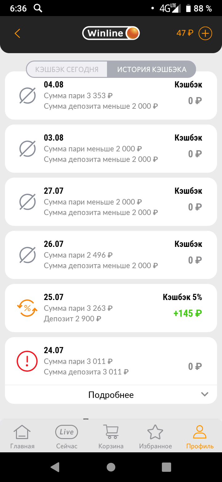 Согласно правилам кэшбека 5% -выплачивается в случае пополнения счета и выполненных сумм ставок свыше 2000 рублей. У меня эти суммы были равны. Букмекер отказал в выплате кэшбека из-за стиля игры. Когда я позвонила на линию мне не смогли объяснить что это значит, чем мой стиль игры отличается, ответили просто, что сумма пари должна быть более сумм пополнения.