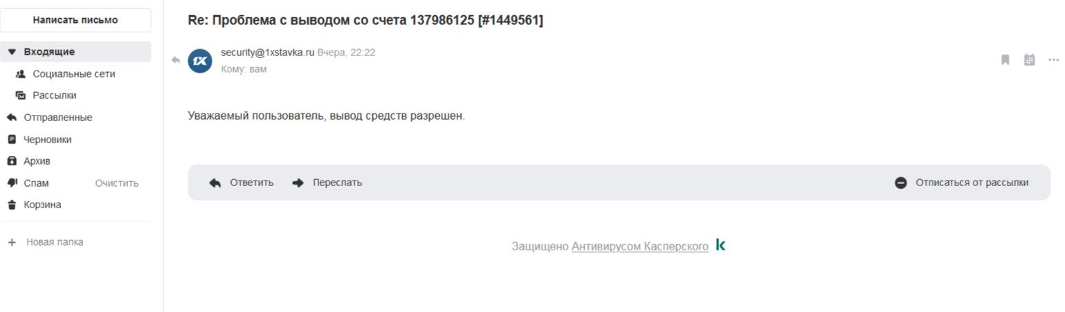 В 22:22 пришло письмо что вывод разрешен, тут же пробую заходить, но авторизация не проходит. Через 15 минут зашел, а на балансе 1100 остаток и 4 ставки красных с суммой и кэфами которых у меня уже полгода как нет, так как аккаунт порезан дважды