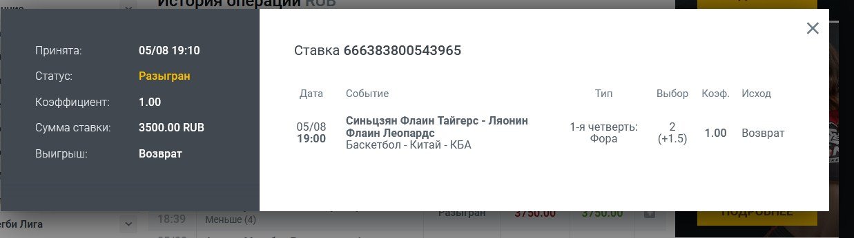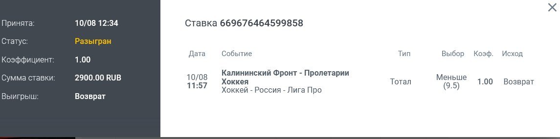 Здравствуйте сделал ставку на 9:00 Синьцзян Флаин Тайгерс - Ляонин Флаин Леопардс Баскетбол - Китай - КБА 1-я четверть: Фора2 (+1.5), сумма 3500,(Ставка 666383800543965)вернули с кэфом 1, ответ стандартный: Благодарим Вас за обращение в службу поддержки БК Леон. Указанная ставка была отменена (возвращена с коэффициентом ), так как во время трансляции матча возникла техническая ошибка, вследствие которой ставка была принята некорректно. В соответствии с пунктом 5.4 Правил БК Леон ставки могут быть отменены (возвращены с коэффициентом ) в случае возникновения программных сбоев и других случаях отражения некорректных сведений в линии. делаю ставку (Ставка 669676464599858) Калининский Фронт - Пролетарии Хоккея ТМ9,5, под кэф вроде.. ставка заходит, она рассчитывается ,заходит на баланс, через примерно часа два пересчитывается и зачитывается с кэфом 1, служба поддержки отвечает стандартно