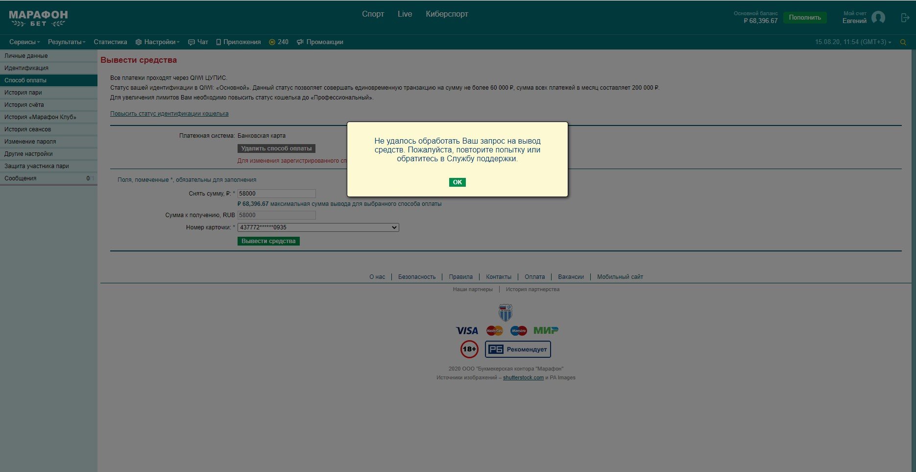 Верификацию я успешно прошел, не сколько раз небольшие суммы до этого выводил без проблем. Вчера 14 августа БК перестала принимать запрос на вывод денег. Выходит ошибка со следующей формулировкой: "Не удалось обработать Ваш запрос на вывод средств. Пожалуйста, повторите попытку или обратитесь в Службу поддержки. ". Пытался несколько раз говорит по чату и звонил в службу поддержки, советуют стандартные вещи: перезапустите компьютер ит.п. говорят не видят даже попытки вывести средства. Я пробовал и через мобильное приложение и через ПК версию, но ошибка та же. Причем депозиты проходят бз проблем. Прошу помочь в решении данной проблемы. Мой аккаунт: nuuuke Номер счета: 6930846. Прошу помочь решить проблему.