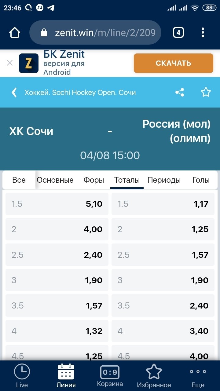 Я поставил тоталы России (мол) больше 2, 3,5, 4,5, а также и победу России (мол) и х2.