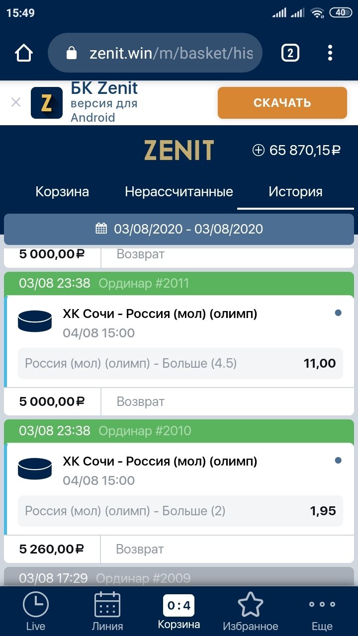 БК Зенит неверно рассчитал сделанные мною ставки, рассчитал возвратом с кэф 1.