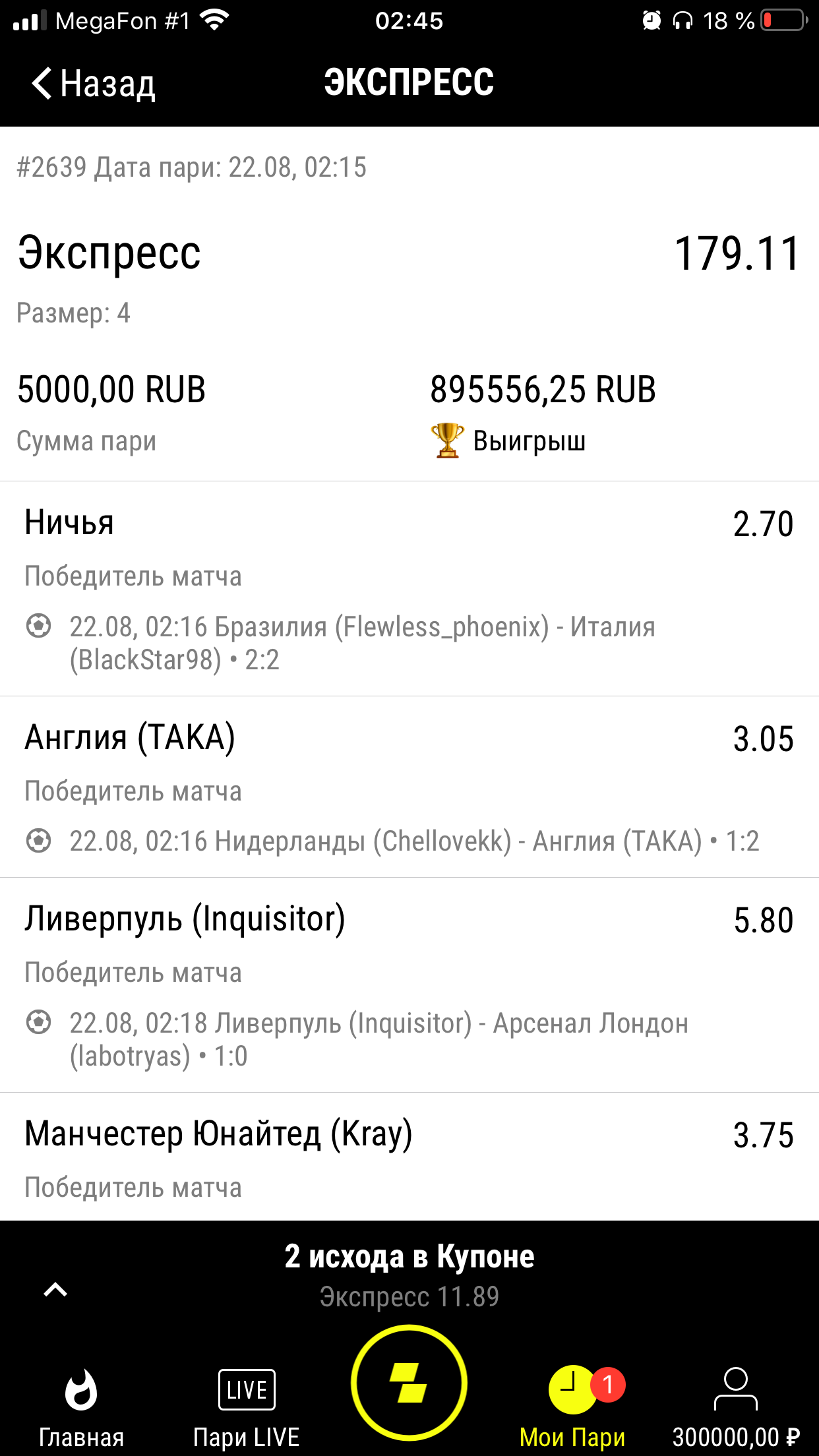 Добрый день, уважаемый легалбет . Играю несколько лет и никогда не было проблем с выводом средств. Впервые выиграл крупную сумму с экспресса 895000 , добил до 900000 , но вывести не получилось , БК запросил повторную верификацию . Я все отправил , документы приняли , но точных сроков не сказали . Прошу вас поспособствовать решению моего вопроса.