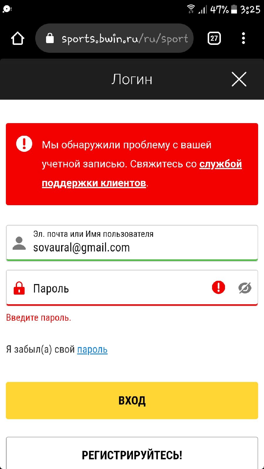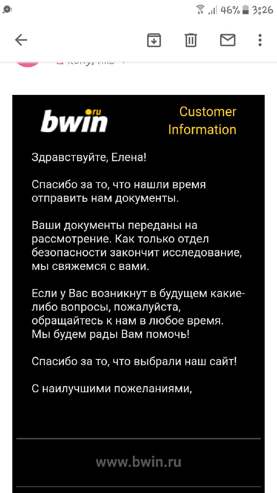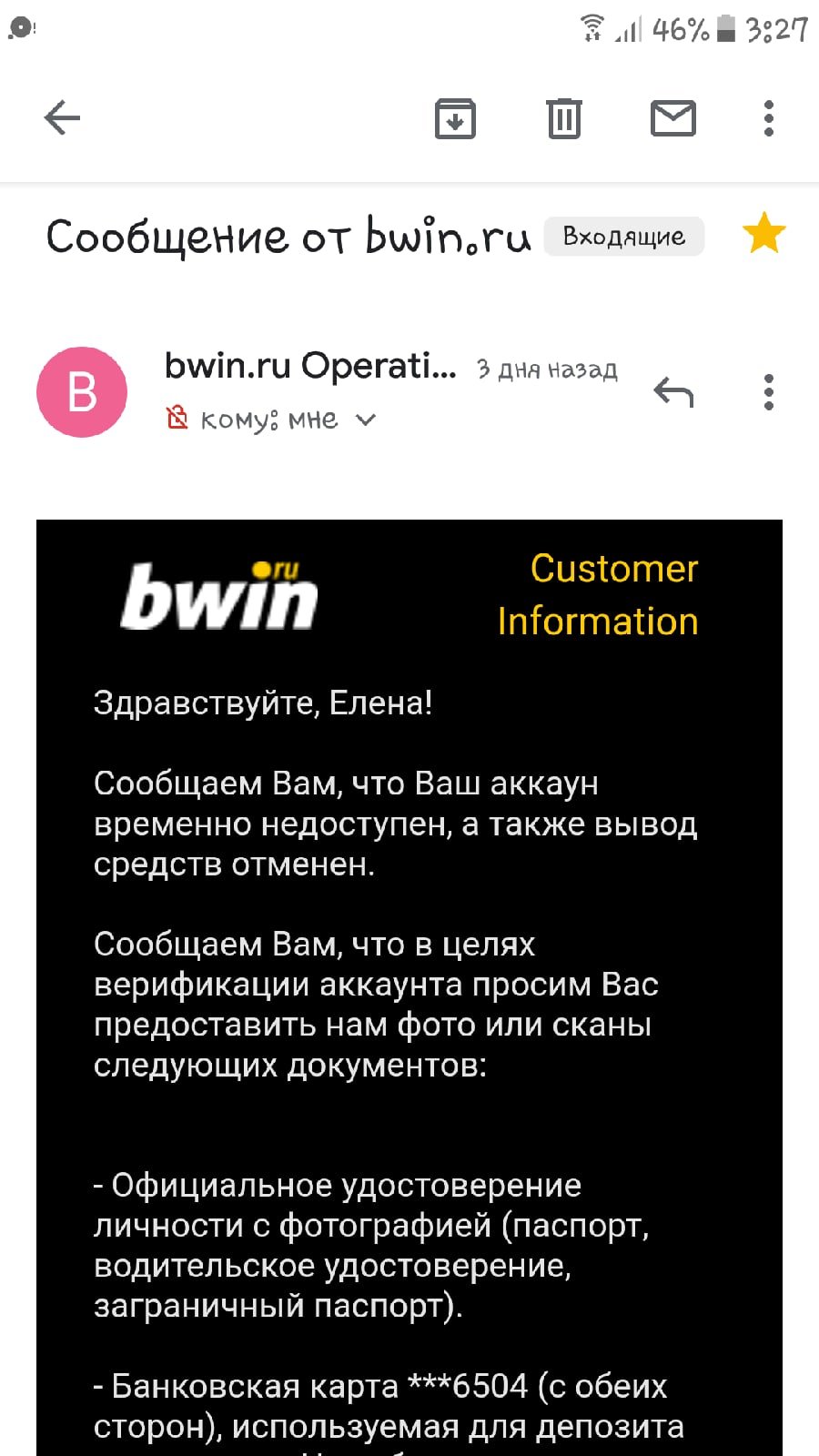 Здравствуйте, Легалбет! Прошу у Вас помощи! Зарегистрировалась в бк Bwin, поставил несколько ставок и выиграла. Букмекер заблокировал мне аккаунт и не даёт вывести ₽. Написала письмо на почту, запросили документы, все сделала.Пишу в онлайн-чат, который работает через раз, ссылаются на какие-то проверки, точных дат не называют. Читаю жалобы на букмекера, и боюсь что вообще не отдадут теперь деньги.Уже не знаю, что делать, помогите пожалуйста!