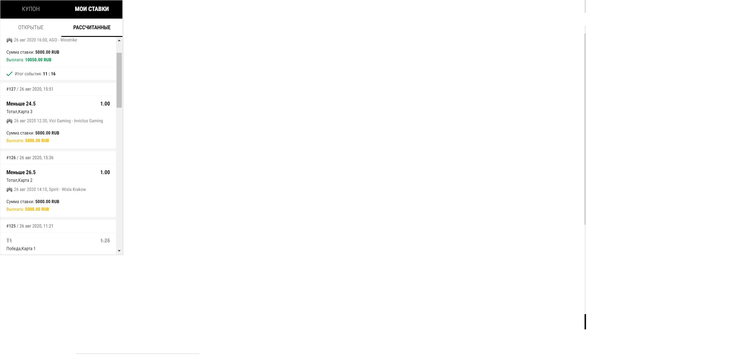 Здравствуйте прошу помощи в решении вопроса с рассчетом ставок в БК Париматч! 26 авг 2020 сделал ставку на матч по CS GO в лайве на игру Spirit-Wisla Krakov и Vici - Invictus на тотал в карте меньше 26.5 и тотал меньше 24.5, на коэффициенты и мне сделали возврат этих ставок хотя исходы выиграли, ссылаются на то что произошёл технический сбой, только в чем он заключался не понятно. коэфициенты постоянно менялись в соответствии с игрой, считаю это крайне подло! помогите разобратся с нечестными действиями со стороны БК