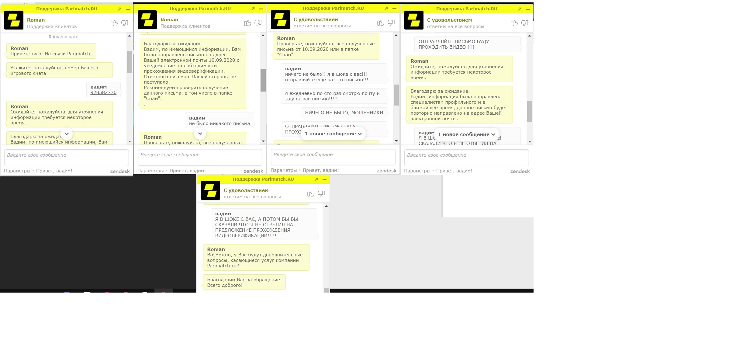 отправил в париматч письмо с логином и датой для видеоверификации, ответа на то письмо не поступило, написал на сайте в тех. поддержку, там сказали что никакого письма не было, я оставил логин скайп и дату 21.09.2020 15:00 для видеоверификации в тех.поддержке сказали что информация передана ожидайте звонка, и вот наступило 21.09.2020 время 17:10 никакого звонка не было, в поддержке снова попросили логин скайп и дату, написал им звоните сейчас но мне так и никто не позвонил, вот такой вот париматч!!! легал бет абсолютно ничего не делает, создает лишь иллюзию помощи.