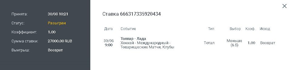 Здравствуйте, то что случилось иначе как мошенничество нельзя назвать! Сделал ставку в лайве в перерыве на хоккейный матч Толпар — Ладья ТМ 6,5. Ставка выиграла, ее рассчитали как выигрышную, захожу в историю через 5 минут и вижу что ее аннулировали!!! Задал вопрос и мне ответили, что якобы В НАЗВАНИИ ВТОРОЙ КОМАНДЫ БЫЛА ОШИБКА!!!!! И ВМЕСТО "ЛАДЬЯ" БЫЛО НАПИСАНО "ЛАДА"!!!! ЭТО ЛОЖЬ!!!!!!!!!!!!!!! НА ПРОТЯЖЕНИИ ВСЕГО МАТЧА БУКМЕКЕР ПРИНИМАЛ СТАВКИ НА ЭТО СОБЫТИЕ И В НАЗВАНИЯХ КОМАНД НЕ БЫЛО НИКАКИХ ОШИБОК!!!! БУКМЕКЕР МОШЕННИК ИСПОЛЬЗУЕТ ЭТУ СХЕМУ ДЛЯ НЕЗАКОННОГО ИЗВЛЕЧЕНИЯ ПРИБЫЛИ!!! В СЛУЧАЕ ЕСЛИ СТАВКА ВЫИГРАЛА БУКМЕКЕР ПРОСТО ОТВЕТИТ ВАМ ЧТО БЫЛА ОШИБКА В СЛОВЕ И ЗАБЕРЕТ ВЫИГРЫШ!!! ТАКОГО БЕСПРЕДЕЛА Я ЕЩЕ НЕ ВИДЕЛ НИ В ОДНОЙ КОНТОРЕ. НУ ЧТО ЖЕ, Я НАПИСАЛ ЗАЯВЛЕНИЕ В ПОЛИЦИЮ И В НАЛОГОВУЮ ПО ФАКТУ МОШЕННИЧЕСВТА! А ОСТАЛЬНЫМ ИГРОКАМ СОВЕТУЮ БЕЖАТЬ ИЗ ЭТОЙ КОНТОРЫ!!!