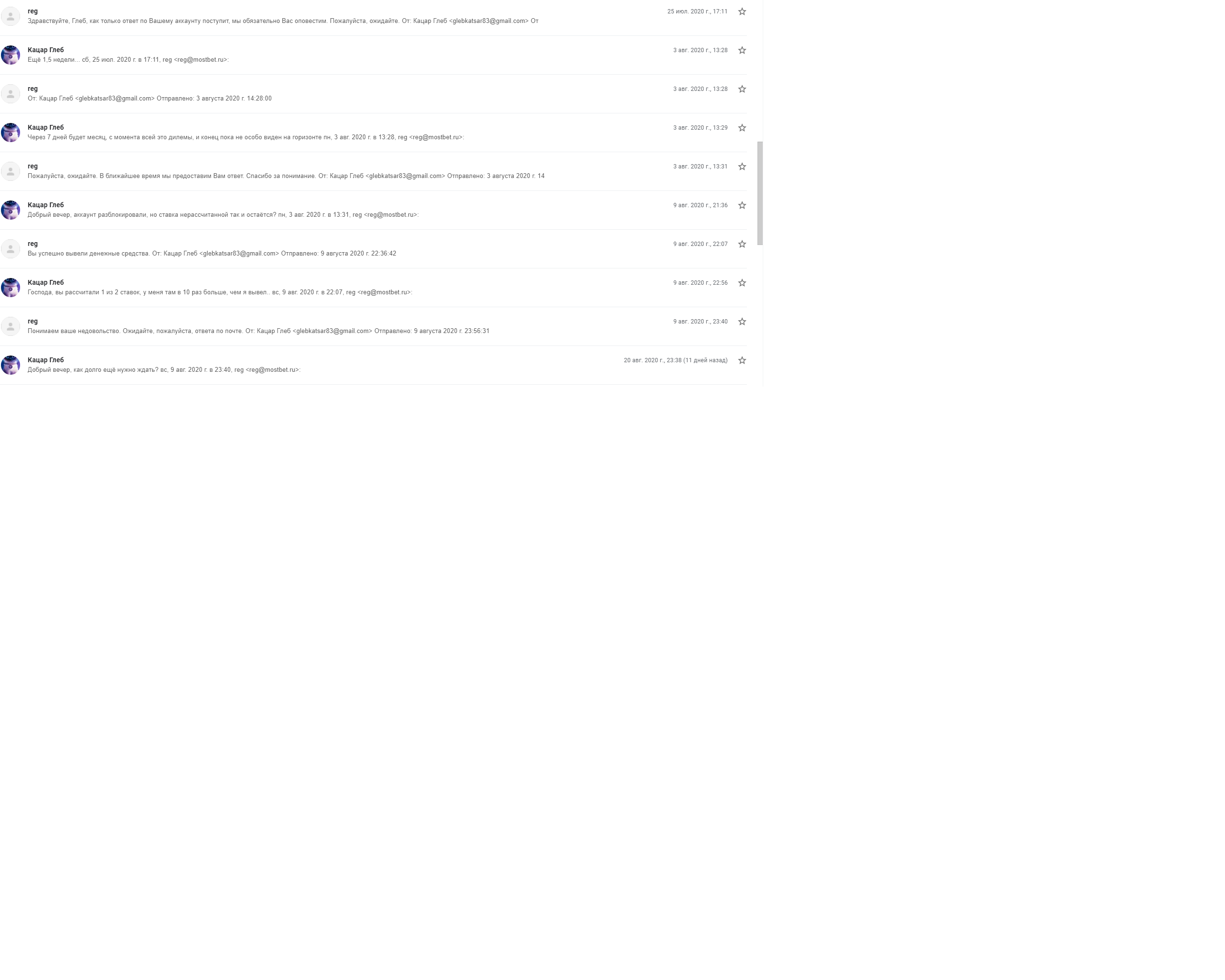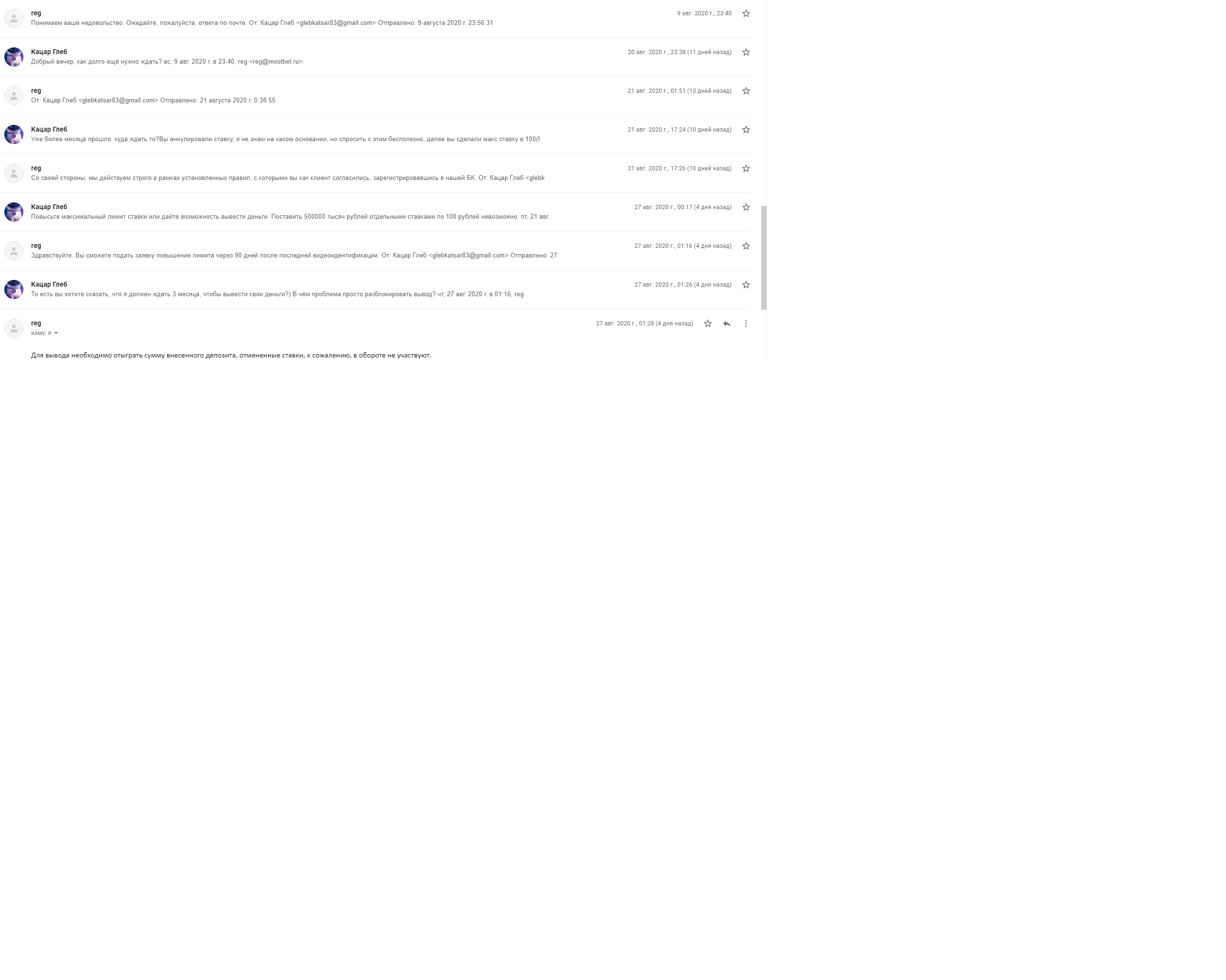 Добрый день, залил на данную бк 503000 рублей, проставил в 2 ставки 500000 и 3000 рублей соответственно. Ставку в пол миллиона аннулировали, но это не суть.Прогнали через видео-верификацию 13 июля далее я ждал до 9 августа и дали вывести 4500 тысячи рублей, так как 2-ая ставка всё ещё висит в не рассчитанных.В течении нескольких дней её просто рассчитали как возврат и вот тут начинается самое интересное, на ВСЕ матчи лимит 100 рублей.Письма на почту - не помогают,ибо ответы однотипные - вы можете подать заявку на повышение лимитов через 90 дней после видеоверификации или вам нужно отыграть полную сумму депозита, скриншоты переписки прилагаю И финал этого бреда макс ставка в 10!!!!!!! рублей, не знаю,насколько это серьёзная контора и можно ли ей доверять, явные мошенники