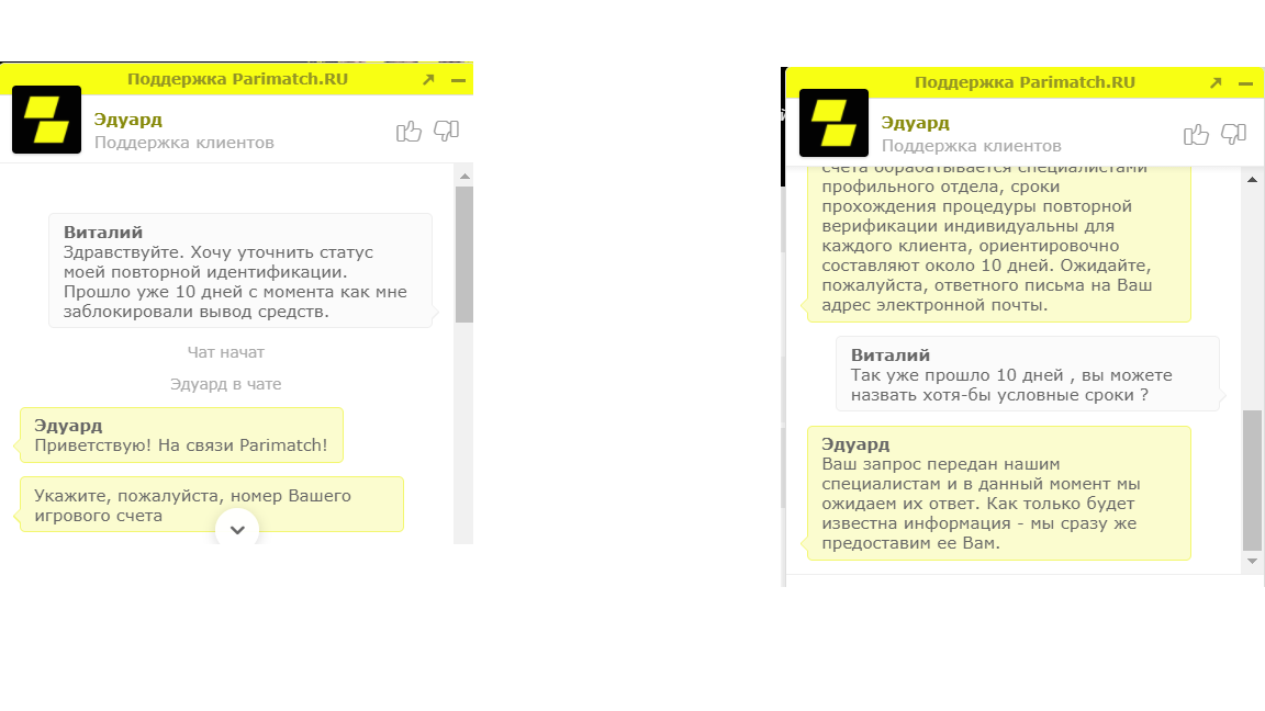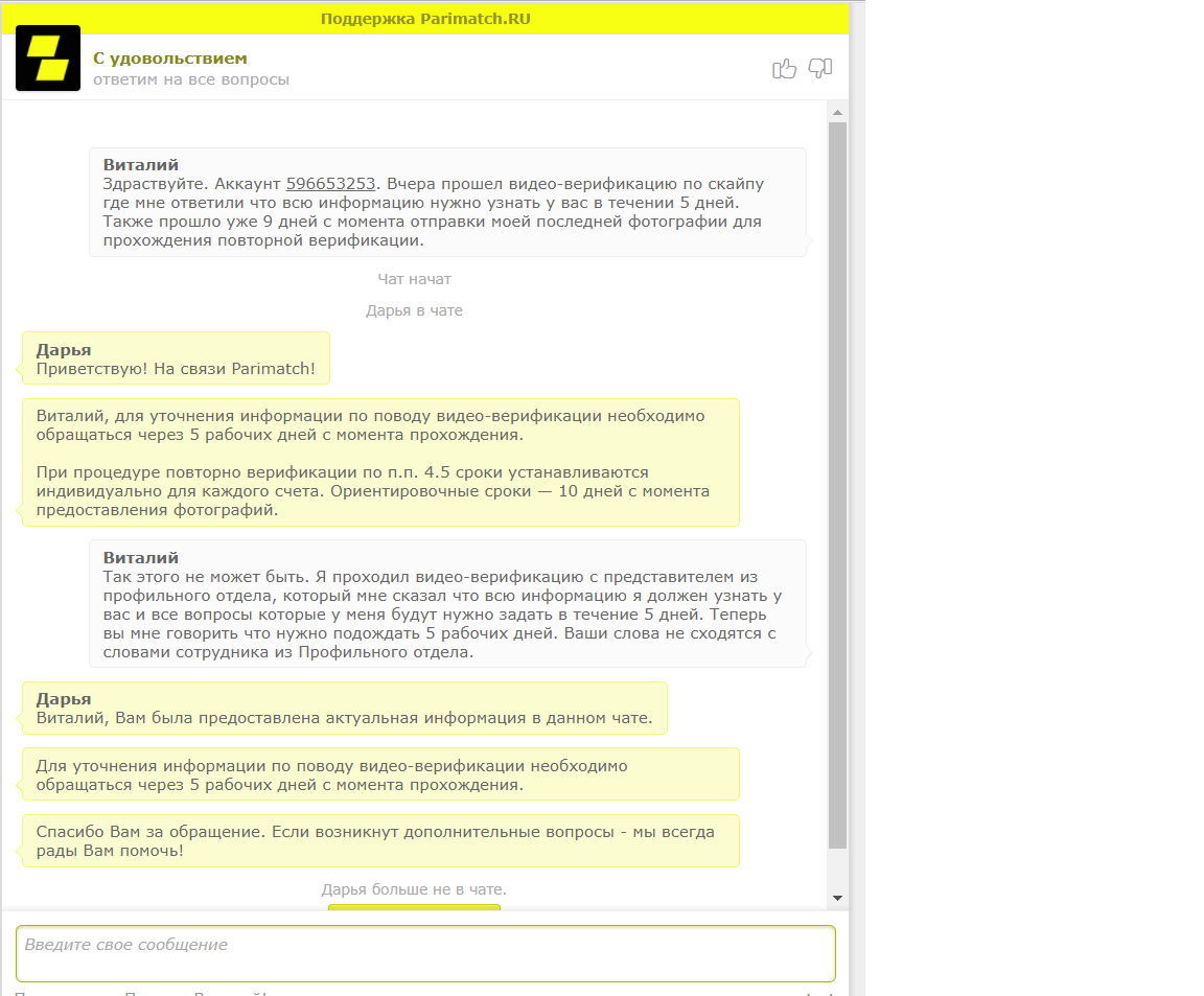 Здравствуйте. Зарегистрировался на сайте данной букмекерской конторы 19 августа, играл средне в +- , в начале сентября заработал крупную сумму в 40+ тысяч рублей и захотел её вывести , но как только нажал на кнопку "Вывод средств" появилось такое сообщение(см. 1 фотографию, при это никаких уведомлений о блокировки счета на почту или на телефон не поступало , обо всем сам игрок должен узнавать и разбираться), после чего поступило обращение в поддержку и был дан ответ , что требуется прислать 2 фотографии удостоверяющие личность, с моей стороны было все сделано и отправлено 1 сентября(см. 2 фотографию), и тут начинается самое интересное: Сначала говорят что процедура займет не более 24 часов, после по телефонной линии говорят что 5 дней, сегодня же уже сообщают что "срок рассмотрения индивидуален"(см. 3 фотографию). Пишу вам с надеждой на то что вы сможете помочь в решение данного вопроса, т.к. вижу со стороны компании постоянно разные ответы, очень понравился сам сайт и его возможности потому хотел бы дальше продолжать ставить на данном сайте , с чем и надеюсь на скорейшее налаживание контакта и решение проблемы.