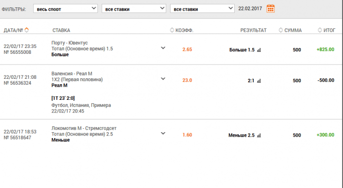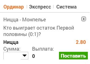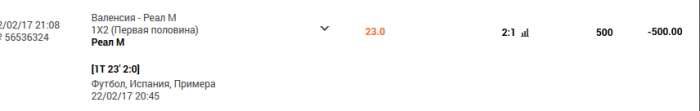500 +300.00 -"ТАМ ЯСНО НАПИСАНО,КТО ВЫИГРАЕТ ПЕРВУЮ ПОЛОВИНУ ПРИ СЧЕТЕ 2:0. И КОФ.СТОИТ И ВРЕМЯ. СЧЕТ ПРИ СТАВКИ АНУЛИРУЕТСЯ. (может и коф.-это их тех .ошибка,но ставка смделана была при этих кофах)