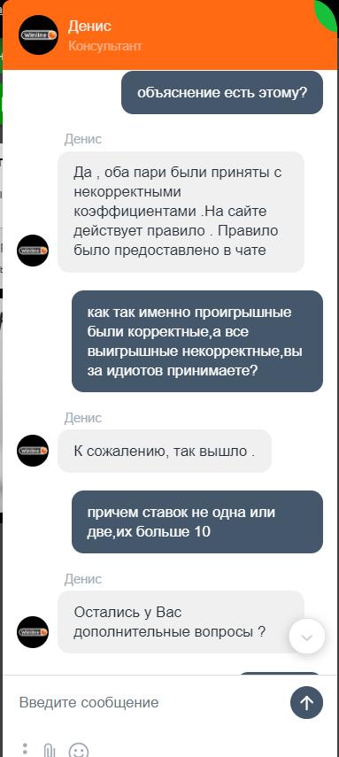 Добрый день. Е-мэйл в Винлайне Сделал несколько ставок на один и тот же матч.Некоторые проиграли,некоторые выиграли. Вот их номера например 353006054 и 353005259. Те,что проиграли мне рассчитали проигрышем,но те,что выиграли долго висели нерассчитанные. Оператор Винлайна ответил,что они будут рассчитаны позже. В итоге их рассчитали возвратом,по их мнению матч договорной. Как возможно на одном и том же матче выигрыши - возвратом,проигрыши-проигрышем