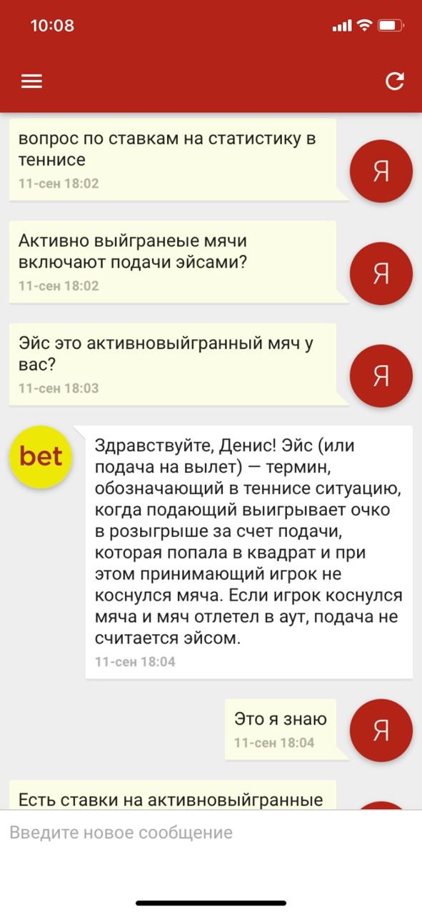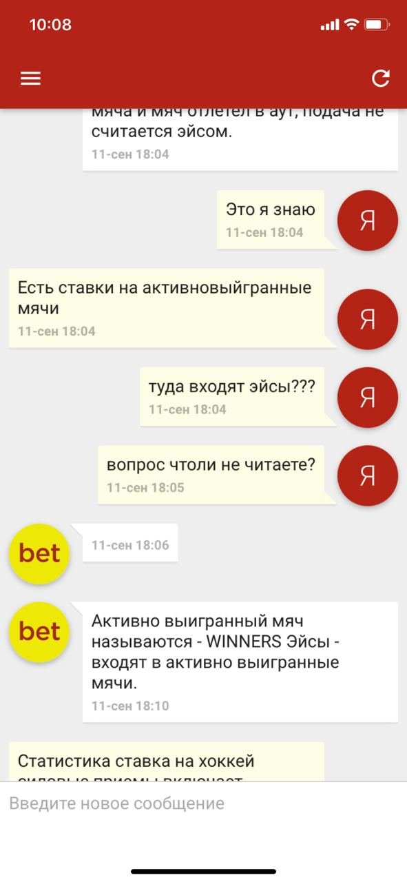 Здрасте Legal Bet, прошу вашей помощи, у меня на счете сложилась «интересная» ситуация: у меня стояла ставка ТМ81,5 активно выигранных мячей на матче по теннису Зверев-Бусты на 1/2 US Open (скрин расчета во вложении).В матче было 37:71 виннерсов ВКЛЮЧАЯ эйсы, что указано на сайте US Open, где графа Stats ВКЛЮЧАЕТ в строке WINNERS сами ACES.Эйсов отдельно было 28.Итого актив выигранных мячей без эйсов = 80. По правилам БК, которые я уточнял в поддержке в онлайн чате (о чем свидетельствует принт-скрин переписки) в стату активно выигранных мячей у Тенесси эйсы НЕ ВХОДЯТ. См. принт скрин. То есть для подсчета нужно ВЫчитать эйсы из актив выйгранных мячей со статистики как us open так и flash score. Поэтому и была сделана ставка в этой конторе. С данным обращением я писалв поддержку ТБ, которая к слову после этой ситуации заблокировала онлайн чат у меня на аккаунте, думая скрыть как оказалось после НЕверный ответ поддержки, но я успел сделать принт-скрин переписки... Поддержка сказала – был факт неверной консультации, изменения купона не будет, купон рассчитан верно, эйсы входят в активно выигранные мячи. Считаю это произволом со стороны БК к давнему лояльному клиенту! Прошу помощи. Прошу:- пересчитать ставку в + относительно консультании персонала поддержки БК- пояснить мне переписку с вашей поддержкой в чате через мобильное приложение, которая уверяла меня в обратном, в чем вижу умысел обман клиентов!- четко указывать что активно выигранные мячи ВКЛЮЧАЮТ подачи как это указано к примеру у БС / 1Х. - пояснить закрытие онлайн чата с поддержкой, намеренно желая скрыть факт НЕверной консультации
