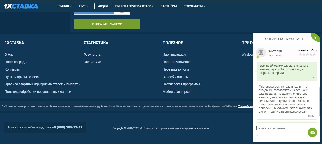 26 сентября 2020 г. Запросил вывод денежных средств со счета. БК отказал в выводе и запросил документы на верификацию, а именно первую страницу паспорта и прописку. Фотки я сделал и дополнительно сделал селфи с паспортом (потому как подобные процедуры уже проходил на OlimpTrade). В чате поддержки уточнил сколько по времени проходит верификация. Ответили, что рассмотрение проходит втечение 24 часов,а в индивидуальных случаях до 72. 29 сентября 2020г. за два часа до истечения 72 часов, опять написал в поддержку на тему того, куда писать, если результата не будет по истечению 72 часов. Они ответили, что писать им в поддержку. И тут же на почту приходит запрос дополнительных документов. Я снова делаю фото (банковская карта с двух сторон с закрытием части номера и куда и выписку со счета где указаны номер карты и мои ФИО) и отправляю. В ответ мне опять пишут: "Ожидайте". В поддержке уточняю время ожидания, а мне снова говорят что продлится это может до 72 часов, потому как это новое обращение. Как оно может быть новым, когда они запрашивают дополнительные документы? А после того как пойдут эти 72 часа, запросят ещё что-нибудь? И так может длиться бесконечно? Прошу, помогите разобраться. Данные отчётливо видео на фото, установить по данным документам личности можно без труда (как говорил выше, проходил подобные процедуры).