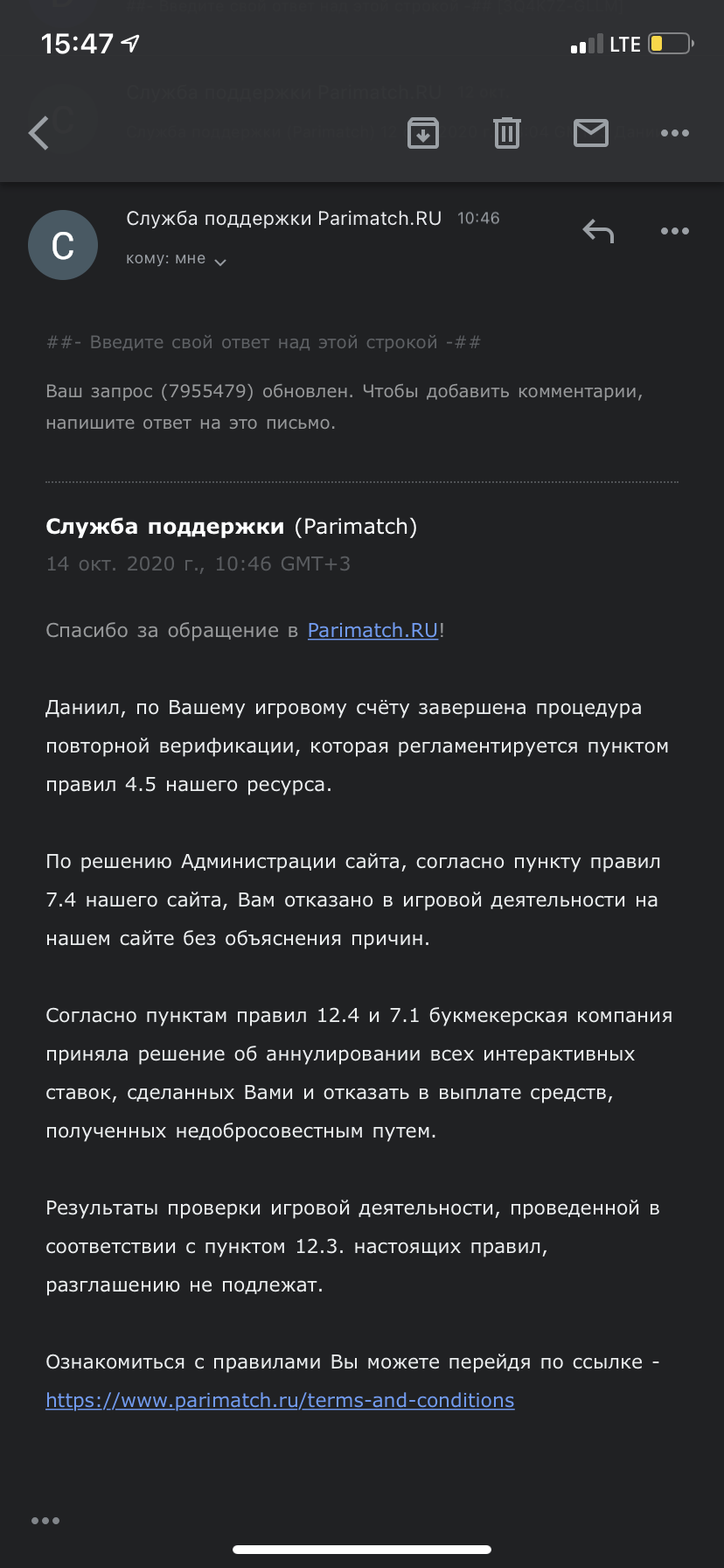 Здравствуйте, столкнулся с проблемой бк Париматч. делал ставки и выиграл, играл абсолютно честно! Когда снимал часть выигранных средств - прошел видеоверификацию, через день опять делал ставки и при выводе средств увидел блок. Поддержка направила на повторную верификацию, но оттуда ни слуха, ни духа, хотя все требования выполнены. Прошу Вас помочь в этой ситуации! Номер игрового счета: 9550344