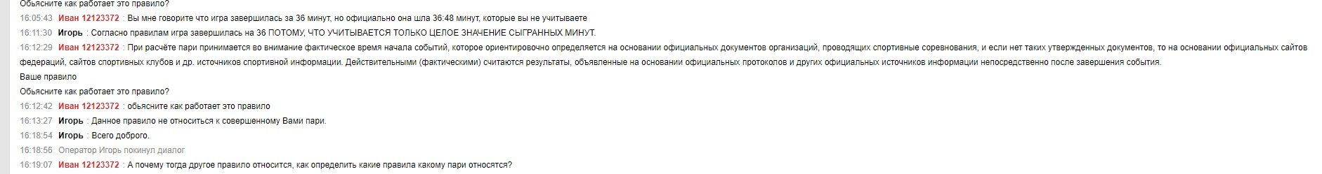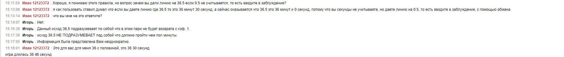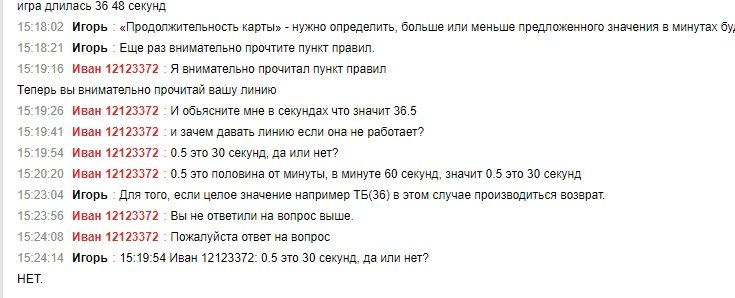 Сегодня Я поставил ставку в на линию 3-я карта Продолжительность (мин): ТБ(36.5), ставку мне рассчитали как поражение, потому что, «Продолжительность карты» - нужно определить, больше или меньше предложенного значения в минутах будет длиться карта. Учитывается только целое значение сыгранных минут, т.е. не учитываются секунды. На мой вопрос зачем они дали линию 36.5, хотя 0.5 не учитываются мне ничего не ответили, я считаю что бк betcity не честно повела себя, так как дала тотал 36.5 при условии что 0.5 не учитывается, когда я увидел 36.5 я посчитал что игра будет дольше 36 минут 30 секунд, т.к 0.5 это половина от минуты, а теперь мне говорят что больше 36.5 это 37 минут, а не 36:31 и так далее. Дальше когда я спросил еще раз что значит 36.5 мне ответили скрин ниже. Я считаю что бк должна мне рассчитать ставку, и дать вывести эти деньги. Закрыть мой аккаунт потому что я не собираюсь больше использовать их бк, так как он вводит людей в заблуждение.