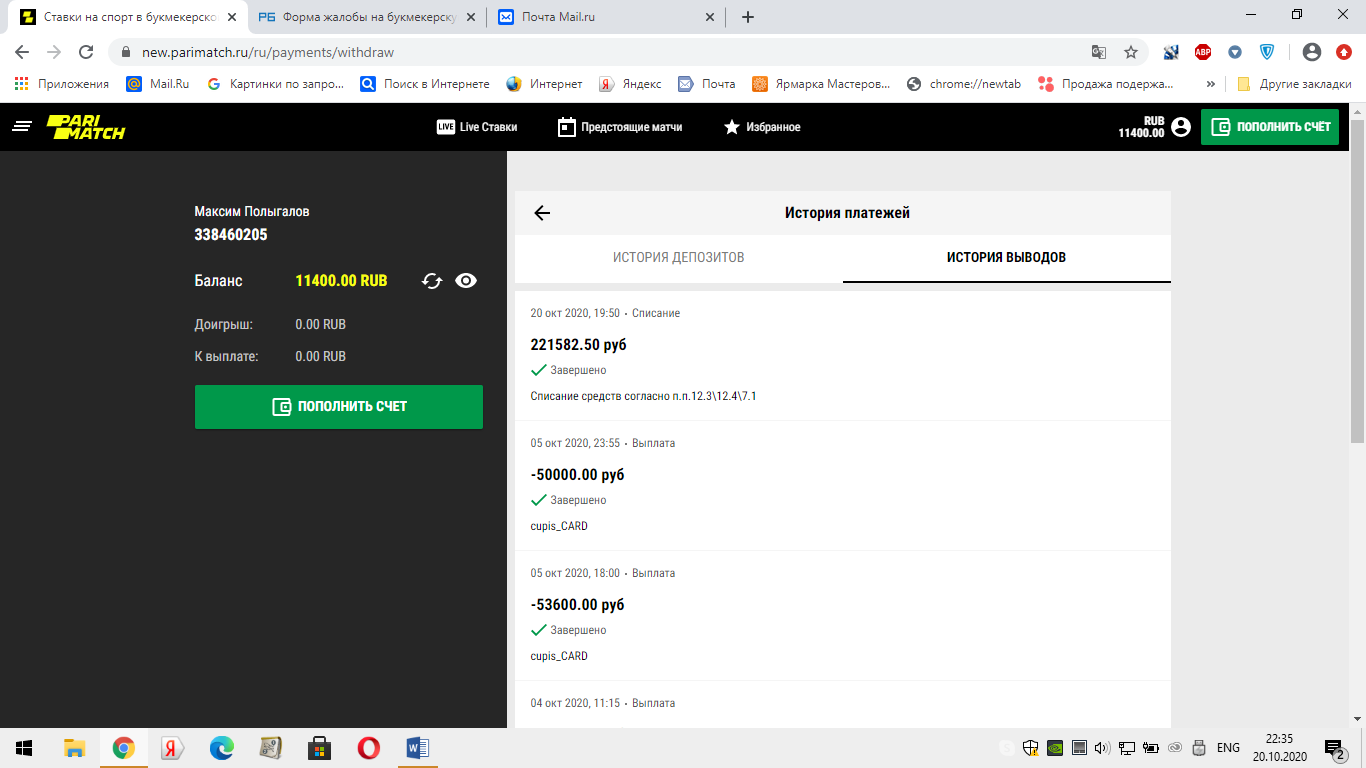 здравствуйте, я зарегистрировал счет ,до этого никогда в данной конторе не играл, вносил на него депозит через свою банковскую карту, ставил ставки в основном в лайфе на разные события теннис, баскетбол. в итоге я выиграл и мне заблокировали счет, прошел все виды проверок в течении двух недель,в том числе и по видео связи,отправил все мои подтверждающие документы, а они взяли мне и аннулировали все мои честно заработанные деньги,сославшись на свои правила что что то я нарушал , а я вообще ничего не нарушал , на все вопросы ответил им, ставлю ставки сам и счет у меня всегда был один.Я вообще не понимаю что творят они за беспредел, у меня уже нерв никаких из-за них нет это вообще что такое они делают. Я взял кредиты чтобы играть, теперь мне нечем отдавать их. Помогите пожалуйста мне вернуть мои честно заработанные денежные средства.Могу также еще кучу доказательств предоставить им если что нужно еще.