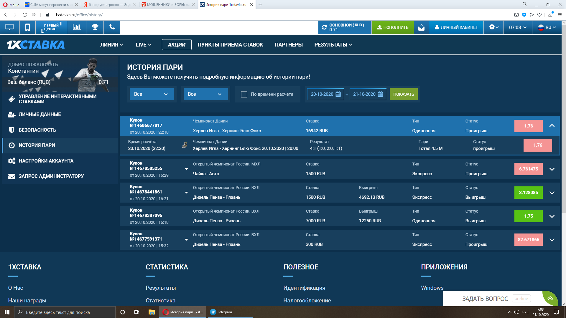 Доброго времени всем! Сегодня пострадал от действий данной ОПГ,по другому и не скажешь. Вернулся с вечерней прогулки,открыл ноут,вошел в аккаунт,на счете 0. Зашел в историю ставок,все неизменно,все мои ставки на месте,думал сбой,написал в Чат,ничего вразумительного не ответили,позвонил в поддержку,сказали,что сделал ставку на 16 492 рубля,на вопрос,почему её нет в истории,сказали,что сам удалил её,НО сделать такое действие игрок не может на их площадке,далее,говорят,что дал доступ третьим лицам,почему нет в истории?обновите,да обновите,скринами им отправлял всё,что нет такой ставки. И о чудо! через час ставка появилась.Ставки на данное событие не совершал!Попросил ихнее СБ,дать АЙПИ адрес...Игнор! Обычно,после работы,выводил все деньги каждый день,так как наслышан о подобных манипуляциях,оставил и вот итог. Видимо вообще дела плохи,раз такими суммами не брезгают.