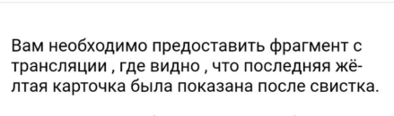 Прошу пересчитать ставку на матч Хаддерсфилд - Дерби Каунти. В основное время было показано 3 карты, а не 4. Я смотрел трансляцию. Ссылка на трансляцию: Также оставляю ссылку на источник для расчета указанный в правилах 1ХСтавка по Англии,в котором указано что 4-ая карта была после финального свистка: Цитирую также правила компании по этому поводу: Желтые и красные карточки, показанные полевым игрокам и вратарю после финального свистка, не будут учитываться при расчетах ставок После многочисленных запросов, меня запросили предоставить "именно запись трансляции с моментом где ЖК показывают после свистка". Мне интересно как показать то, чего нет в трансляции, и зачем мне это показывать, если я пытаюсь доказать что карты не было в основное время.По записям и ссылкам которые я предоставил, все отчетливо видно, что карты в основное время, а именно на 90+6 минуте не было. Прошу разрешить спорную ситуацию, а я могу предоставить даже запись минуты в которой числится ЖК