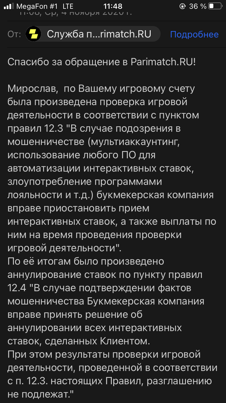 Доброго времени суток, пользовался услугами БК Париматч в течение небольшого времени, проблем с выводом никогда не было, в основном поставил на киберспорт смотрел на специальности сайте статистику команды на той или иной карте и ставил ставки , получилось выиграть 50 тысяч и решил часть вывести но тут мне сразу отказали Назначали видеоконференцию в скайпе На видео конференции я продемонстрировал все документы которые были запрошены , и после этого мне начали задавать вопросы про кибер спорт , соотвественно на базовые вопросы я ответил Потом начали задавать совершенно не реальные вопросы наподобие назови состав команды Виртус про , назови состав команды эмига Составов команд я не знаю , они это поняли и начали задавать совершенно нереальные вопросы в области киберспорта( хотя повторюсь в нем я не профессионал , сделал несколько ставок по стратегии они зашли и все ). Так же начали спрашивать про топ 5 команд из разных лиг. Я не углубляюсь полностью с головой в киберспорт В итоге начали расспрашивать у меня совершенно незнакомых мне людей , я сказал , что они не кем мне не приходятся не раз. Далее начали спрашивать, что вам никто не подсказывает?! Я ответил что никто. Через парк вопрос они снова спросили меня про это. Я камерой показал, что никого рядом нет, хоть я и был на улице. Я считаю , что это доходил до абсурда, и я считаю, что они преувеличивают свои полномочия. И хочу попросить вас помочь мне вернуть мои деньги, помочь разобраться в этом деле. Спасибо.