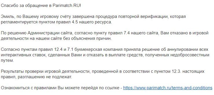Здравствуйте. Подскажите, пришло письмо на почту, что я получал выигрыш недобросовестным путем и банк стал нулем. Хотя я столько проигрывал и выигрывал, что даже не представляю каким путем я мог заполучить их денежные средства. После отправленных мною фото они решили аннулировать банк в 30т.р. Можно ли решить это как-то или пройти может доп. верификацию, хотя б даже видеоверификацию?
