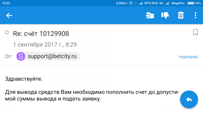 Здравствуйте! Хочу поведать вам по поводу мошеннических действий букмекерской компании Бетсити ( ООО «Фортуна» ). 17 августа 2017 года я зарегистрировался в ней, прошел идентификацию в ППС и ввел с карты на счет 10129908 сумму 500 руб. Сделал всего одну ставку в сумме 100 руб, по которой получил возврат. На следующий день 18 августа 2017 года зашел на сайт и с удивлением обнаружил, что максимальная сумма ставки, которую я могу поставить — всего 1рубль (при условии что минимальная сумма ставки 10руб). Таким образом, Бетсити лишила меня моих гражданских прав в совершении интерактивных ставок без объяснения причин и без ссылки на законодательство Российской Федерации. Кроме этого, компания отказывается выводить на мою карту, с которой я пополнял счет, мои деньги в сумме 500руб, ссылаясь на то, что минимальная сумма вывода 1000руб. Причем, хотят еще 1,5% снять за вывод (хотя, они сами не дают проставить эту сумму). Однако, я опасаюсь вводить еще деньги в эту контору (введу 500 руб, потом могут потребовать ввести еще 500 и т.д. ) Налицо схема обмана. Обращался по данному вопросу в 1 Цупис , но они не хотят разбираться в ситуации (хотя, деньги с карты на Бетсити вводил именно через них) и переадресовывают на Первую саморегулируемую организацию букмекеров России , куда я написал сегодня письмо. Если СРО не решит мою проблему, очевидно, следующим этапом будет обращение в Прокуратуру РФ и другие органы власти России