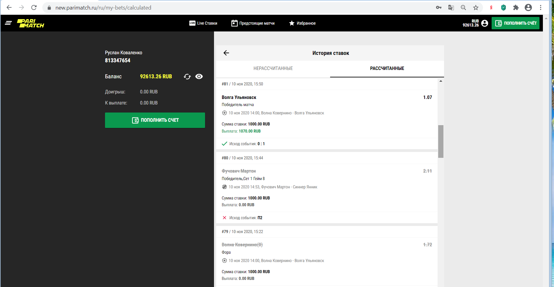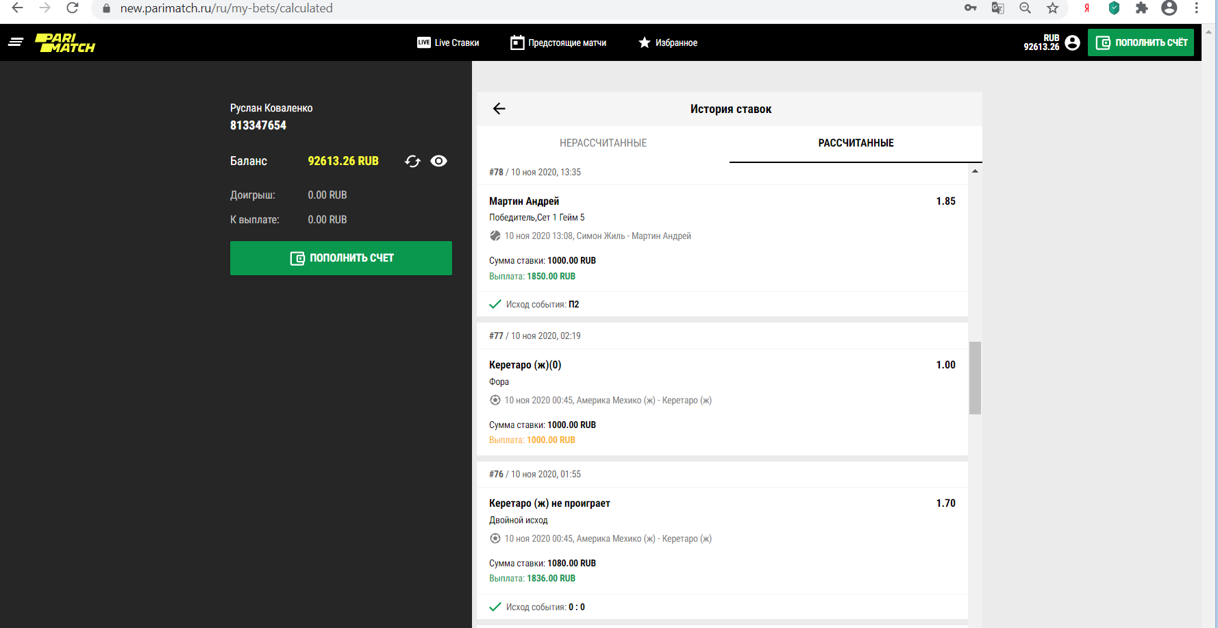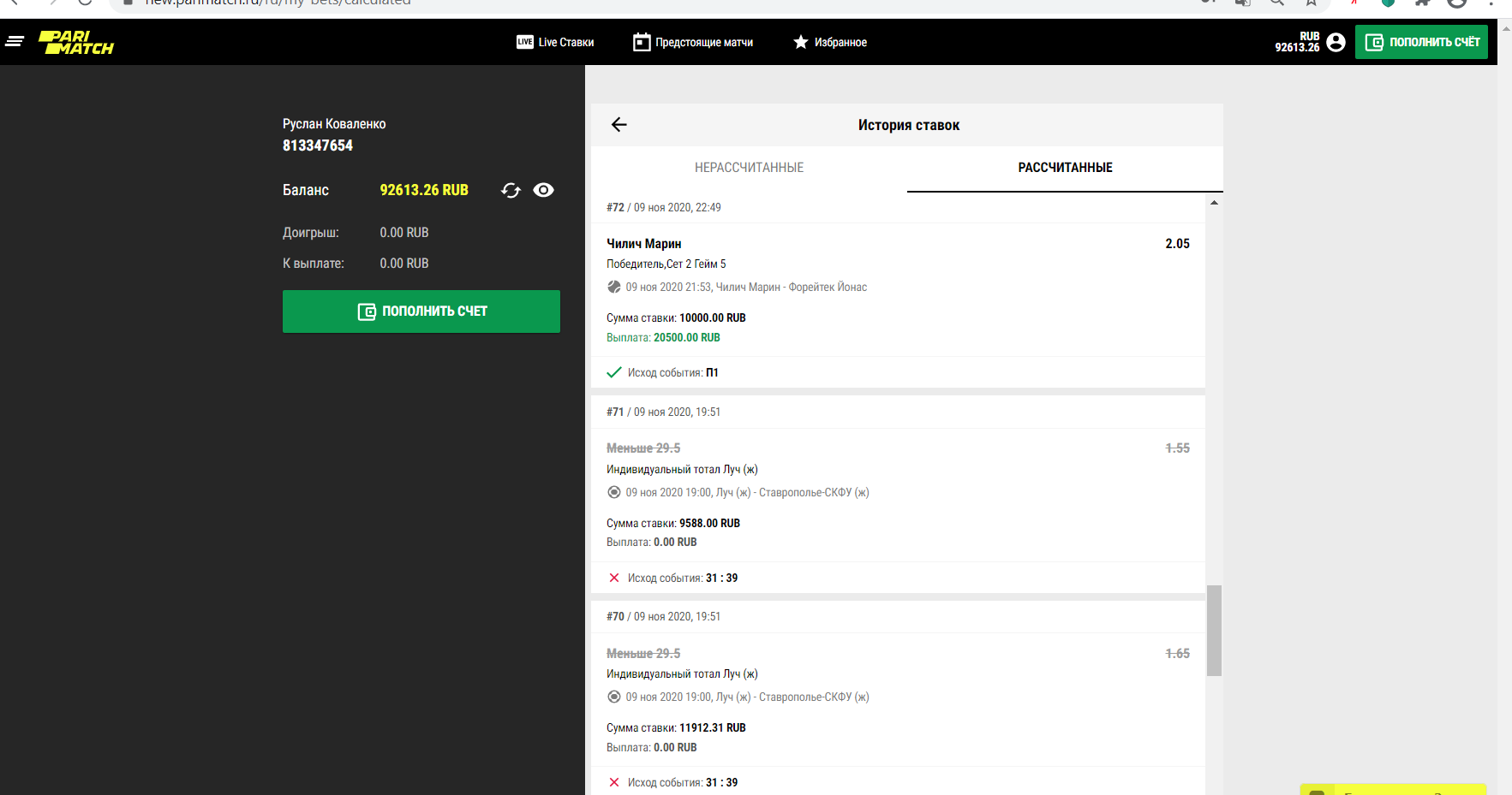 Здравствуйте. Зарегистрировался в начале ноября на Париматч РУ, начал играть и делать депозиты. Завёл в общей сложности своих денег на 54 000 руб. Спустя несколько дней игры то в плюс то в минус, баланс моего счёта достиг отметки 92613 руб. Я попытался сделать первый вывод денежных средств со своего счёта, но у меня моментально запросили пройти верификацию и урезали максимальную ставку. Все необходимые документы отправил в Париматч. Уже почти неделю от них нет ответа. Ставки были абсолютно честные на разные виды спорта и топовые матчи, никаких ошибок не ставил. Почему букмекер Париматч РУ удерживает мой честный выигрыш, а так же и мой депозит? Играть больше в этой конторе не желаю, просто отдайте мои честно выигранные деньги. Прошу помочь мне в этом споре.
