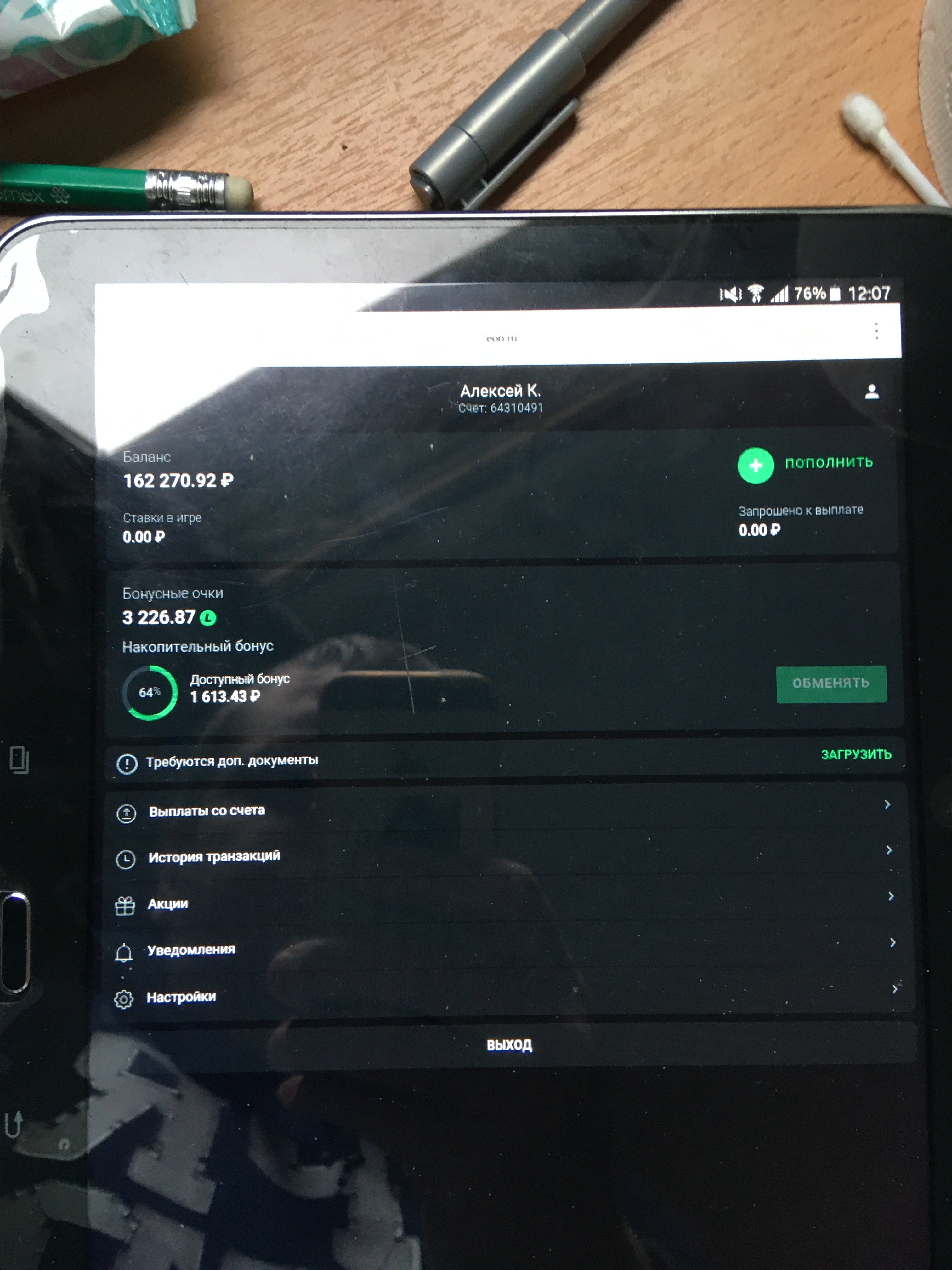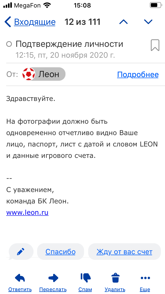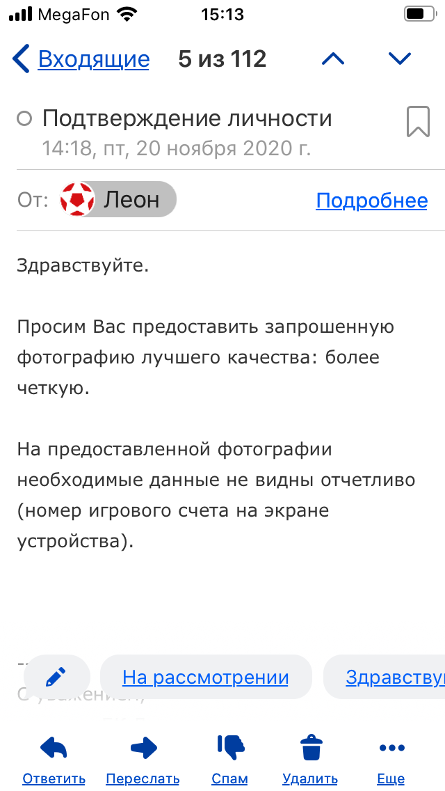 Вечер добрый!прошу помочь мне с выплатой депозита на БК ЛЕОН. Всё что было отправлено для подтверждения личности, карта банка с двух сторон с который пополняется депозит на аккаунте фото паспорта с приложенным листом с датой и надписью ЛЕОН, моё фото с паспортом и и листком с датой в руках,инн,фото регистрации ,банковские справки на подтверждения операций от моего имени, чек с подтверждением места прописки,но им мало, они просят ещё справки с жкх которые я не оплачиваю,у меня их просто нет априори, прошу Вас помочь в данном вопросе.