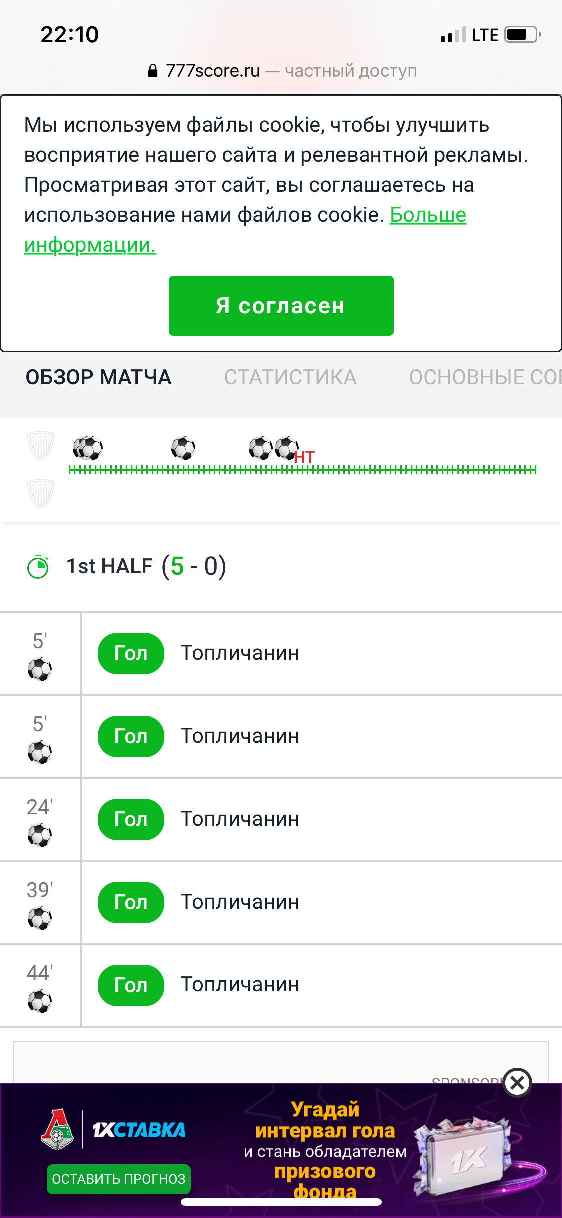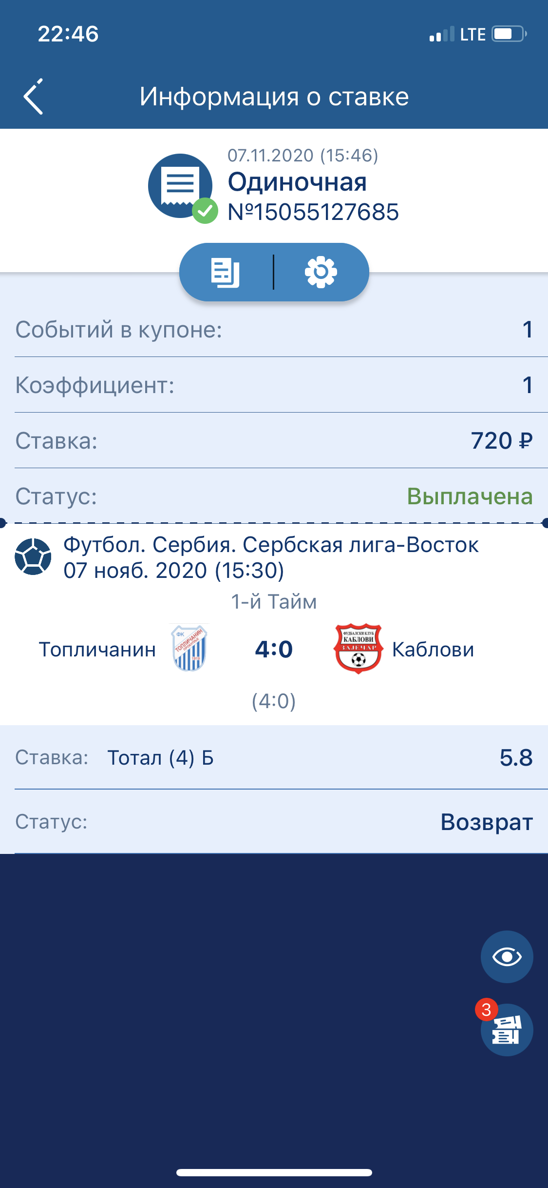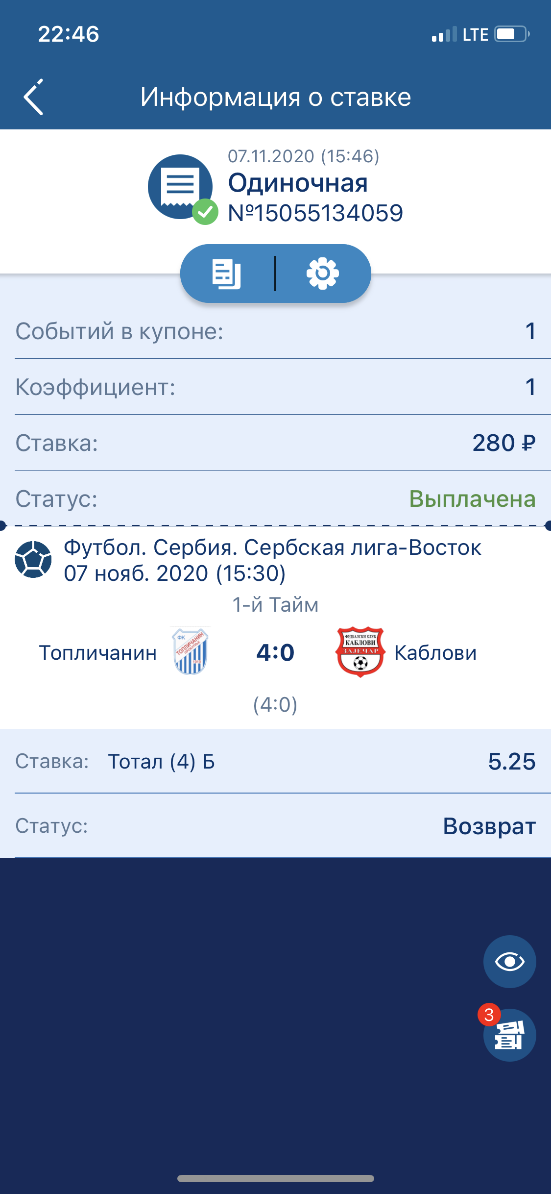 Сделал несколько разных ставок на матч. В итоге после первого тайма уже сыграло пару ставок, которые тут же были рассчитаны и на счёт поступили выигранные средства. На втором тайме игру заблокировали и спустя некоторое время моему изумлению не было предела-мой счёт оказался в минусе, что было впервые в моей игровой практике. В итоге выяснилось что ставки за игру были перерасчитаны т к матч во втором тайме был приостановлен, а счёт первого тайма чудесным образом изменён с 5-0 на 4-0. Хотя в источниках счёт первого тайма по прежнему 5-0. Ну и как уже завелось боты консультанты внятного ничего отвечать так и не научились кроме того, что это ваша проблема разбирайтесь сами (утрируя конечно).