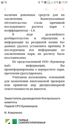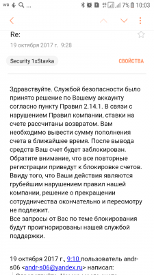 Здравствуйте. Вчера у меня на счете была сумма в размере 112000 рублей. Сегодня с утра баланс моего счета составляет 6800 рублей, при этом все совершенные мною ставки рассчитаны с коэф. 1, даже те которые были совершены более 3х месяцев назад. Суппорт БК сослался на пункт .1 Правил и заблокировал счет. При этом мне не указали конкретно в чем меня подозревают. Я не обладал информацией о результате событий, не мог на них влиять - ставки делались на лигу чемпионов, топ футбольные чемпионаты, турниры большого шлема по теннису. Я не делал ставки группой лиц чтобы превысить ограничения установленные компаниец - размеры моих ставок были намного ниже предложенных лимитов. У меня нет других счетов в компании 1x ставка. Считаю что в данном случае компания поступила необоснованно. Они не указали мне вообще в чем заключается нарушение правил. Прошу Интелбет разобраться. Если меня обвиняют в создании нескольких счетов - пусть их предъявят. А так получается я просто слишком хорошо делаю ставки и компания не зазотела выпоачивать мой выигрыш. Считаю, что это хищение денежных средств.