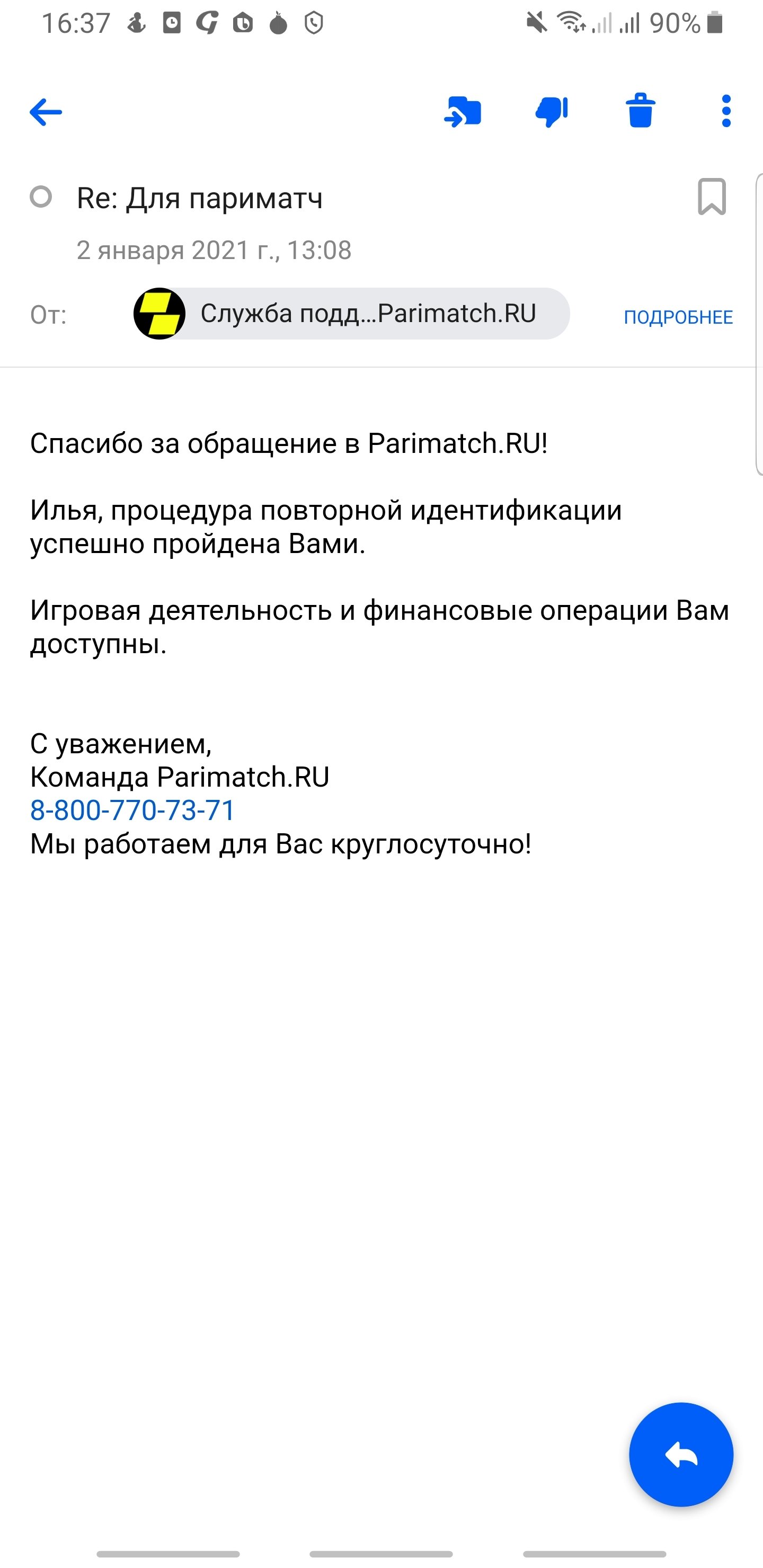 Здравствуйте,прошу разобраться в данной проблеме как можно скорее ,потому что я не понимаю в чем дело я прохожу видеоверификацию, спокойно девушка оператор подтверждает говорит можете выводить денежные средства, я делаю запрос на вывод 50к деньги приходят на карту в течении 15 мин ,оформляю еще пару заявок сразу на выплату ,их букмекер отменяет ,и тут мне показывает позвоните в службу поддержки для уточнение информации, и они мне начинают пришлите нам фотографии вашего паспорта ,потом вы с паспортом и листом бумаги где написать "для Пари Матч, я объясняю что я только что прошёл видеоверификацию для первого вывода ,только что, буквально 30мин назад,и мне блокируют вывод! Отправил все нужные фотографии на почту ,спросил долго ли будут проверяться ,мне отвечают что проверка для каждого клиента индивидуальная ,как это индивидуальная скроков не сказали ,а если она будет идти месяц, или два месяца, что там проверять ,2 фотографии, это не много я думаю ,и много времени не займёт.сумму наиграл приличную и если мне так и восстановят вывод ,я пойду по всем инстанциям, суд ,и так далек ,Но я надеюсь что Пари матч до этого не доведёт.