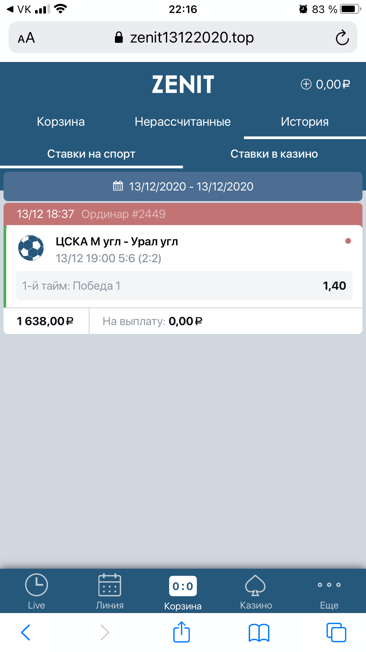 Добрый день! Логин 4731967. Номер ставки 2449.Итог первого тайма Победа 1 (2:1) по данным всех ресурсов + сам смотрел трансляцию, в линии тоже верно было указано в 2:1 до перерыва, после чего линию заморозили на событие до его завершения. Примерно через час отобразили не актуальную информацию, 2:2 первый тайм (по факту 2:1), 5:6 по результату события (5:5). Ссылаются на свой источник , перепроверять информацию и публиковать достоверную информацию отказываются. При общении по телефону и переписке ведут себя очень не красиво, хамски и наплевательски.