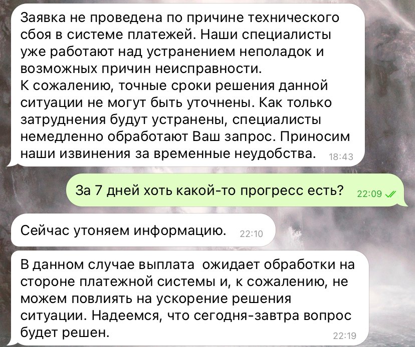 Поставил средства на вывод, прошло уже 8 дней, деньги висят в выводе до сих пор. Обращался в тех поддержку, каждый день говорят одно и тоже: какие-то технические трудности со стороны платежной системы, ожидайте. За 8 дней абсолютно никакой новой информации, говорят, что ничего сделать нельзя, можно только ждать, хотя максимальный срок вывода средств, указанный на сайте-3 дня.